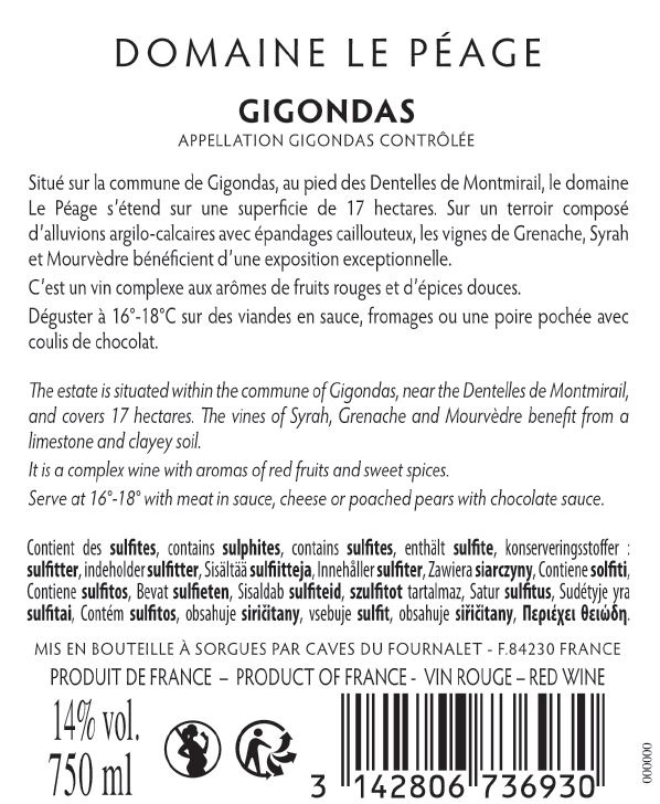 | Libellé | Domaine Le Peage, 2023 - Gigondas AOP - Rouge - 75 cl |