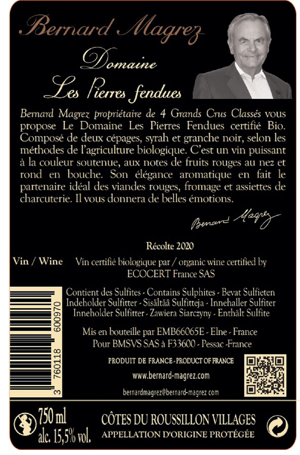 | Libellé | Domaine Les Pierres Fendues BIO, 2018 - Côtes-du-Roussillon Village AOP - Rouge - 75 cl |
