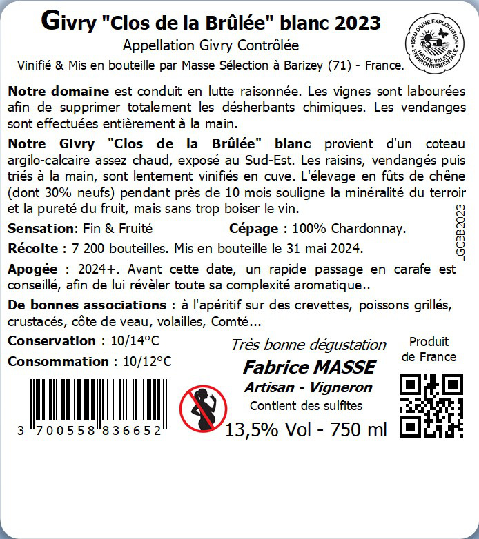 | Libellé | Domaine Masse, Clos de la Brûlée Clos de la Brûlée, 2023 - Givry AOP - Blanc Sec - 75 cl |