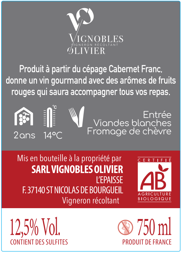 | Libellé | Domaine Olivier BIO, 2022 - Saint Nicolas de Bourgueil AOP - Rouge - 75 cl |