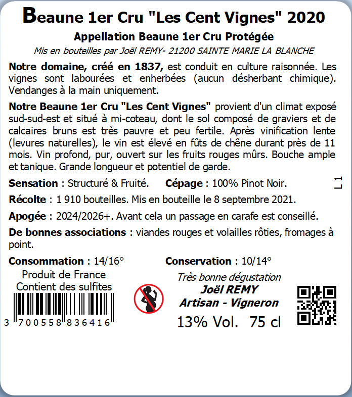 | Libellé | Domaine Rémy & Fils "Les Cent Vignes", 2020 - Beaune 1er Cru AOP - Rouge - 75 cl |