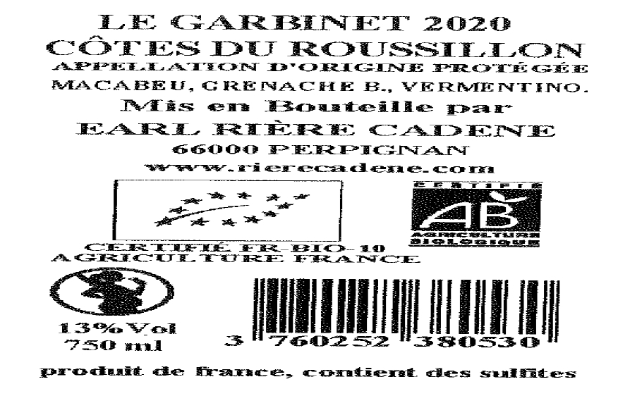 | Libellé | Domaine Rière Cadène Le Garbinet BIO, 2020 - Côtes-du-Roussillon AOP - Blanc Sec - 75 cl |