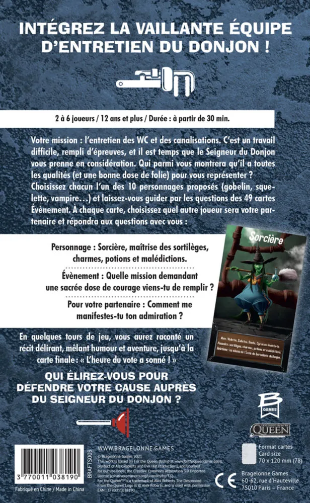 La simplicité d'un party game, les sensations du jeu de rôle ! Rassemblez quelques amis et inventez tous ensemble une histoire pleine de rebondissements, en toute simplicité. L’entretien des W.C. et des canalisations d'un donjon est un travail difficile, rempli d’épreuves, et il est temps que le Seigneur du Donjon vous prenne en considération. Qui parmi vous montrera qu’il a toutes les qualités (et une bonne dose de folie) pour vous représenter ? Principe du jeu : Choisissez chacun l’un des 10 personnages proposés (gobelin, squelette, vampire…) et laissez-vous guider par les questions des 46 cartes Évènement. À chaque carte, choisissez quel autre joueur sera votre partenaire et répondra aux questions avec vous. En quelques tours de jeu, vous aurez raconté un récit délirant, mêlant humour et aventure, jusqu’à la carte finale « L’heure du vote a sonné ! ». Qui élirez-vous pour défendre votre cause auprès du Seigneur du Donjon ?