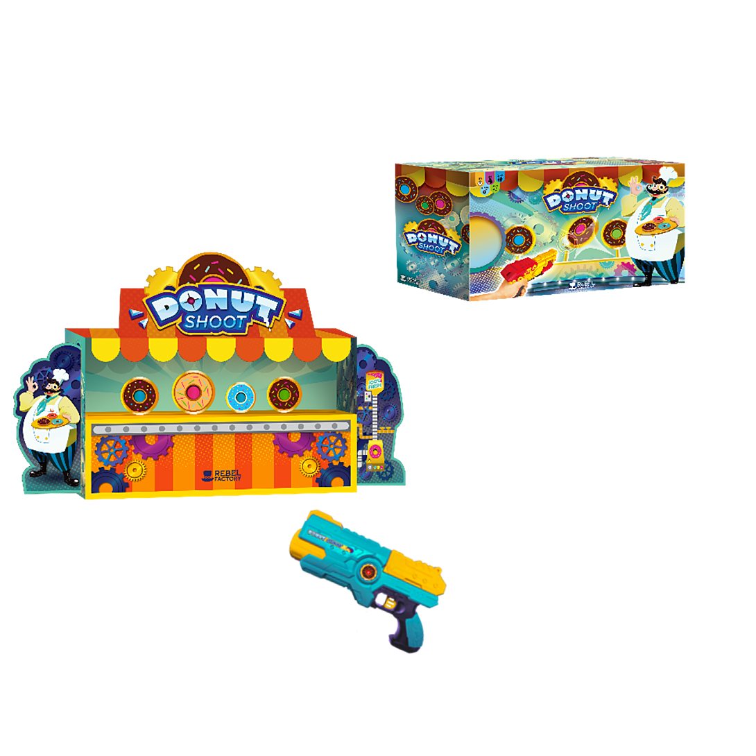 Fini de tirer sur les animaux ! Vise les donuts et améliore ton score à chaque partie grâce au compteur de points. Attention! La tâche n’est pas facile, les donuts bougent sur un rail comme à la fête foraine ! 1, 2, 3 Prêt ? Tirez ! …… Contenu : 1 base de jeu motorisée avec compteur de points, un pistolet 5 coups, 10 fléchettes. Dès 4 ans, temps de jeu 10 minutes