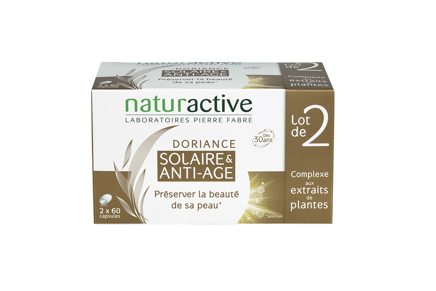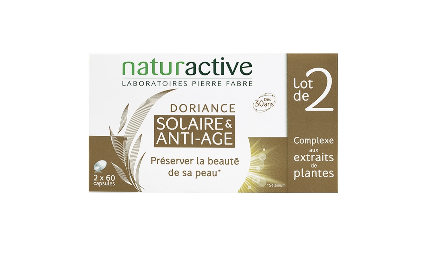 Doriance Solaire & anti-âge de NATURACTIVE est un complément alimentaire contribuant à apporter bonne mine à la peau sans s'exposer au soleil. Sa formule aux 7 phytopigments végétaux, au cuivre, aux vitamines E et C, au zinc et au sélénium aide la peau à acquérir une pigmentation naturelle, tout en la protégeant du stress oxydatif à l'origine du vieillissement cutané. grâce à l'huile de Cameline hautement concentrée en Omégas 3, la peau est plus belle et le teint est éclatant. Convient à partir de 30 ans. Attention : la date limite d'utilisation de ce produit peut se limiter à 3 mois (31/03/2019).