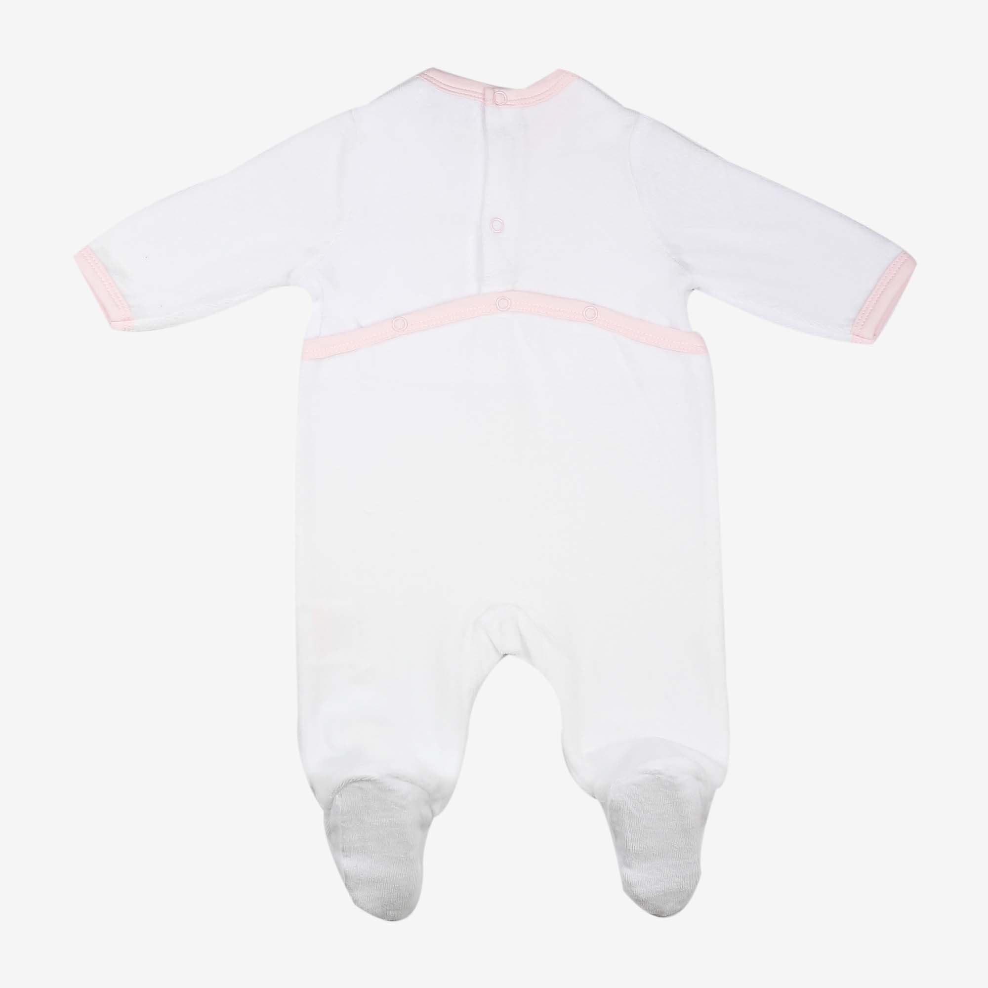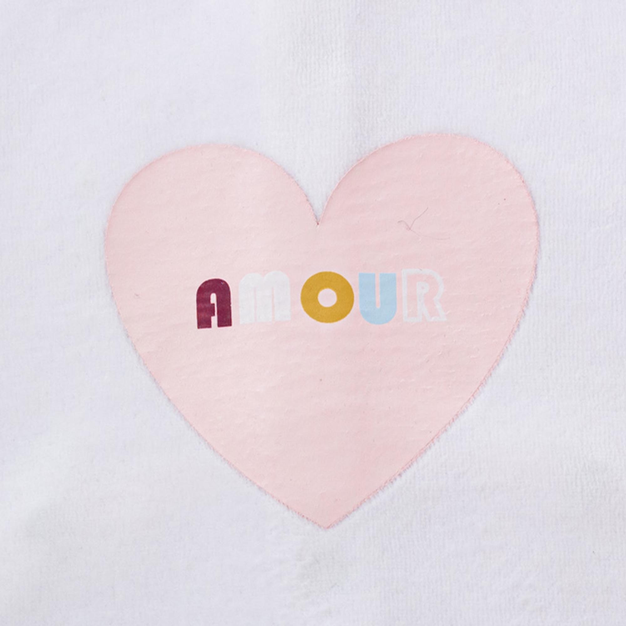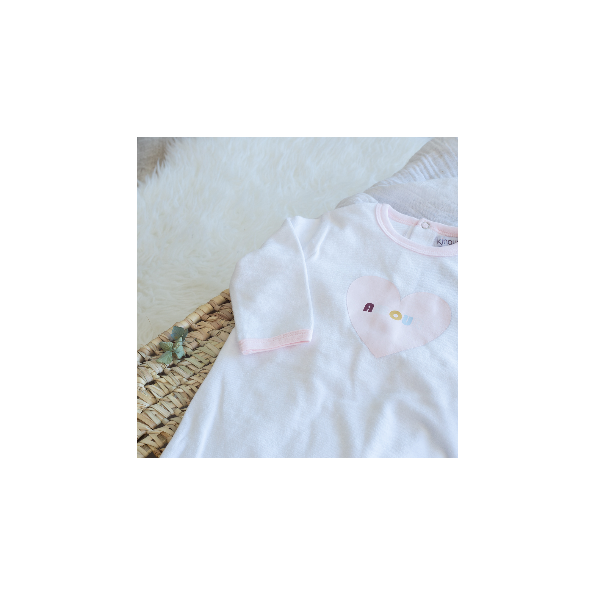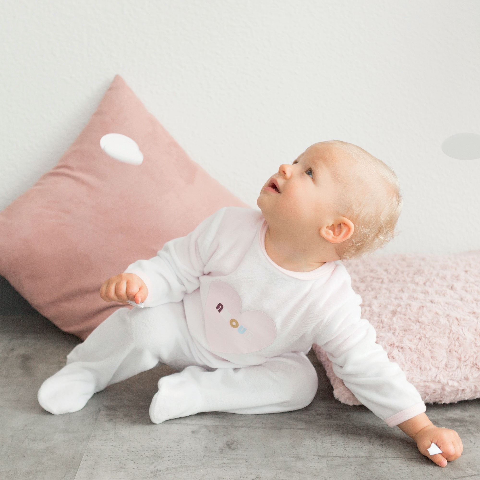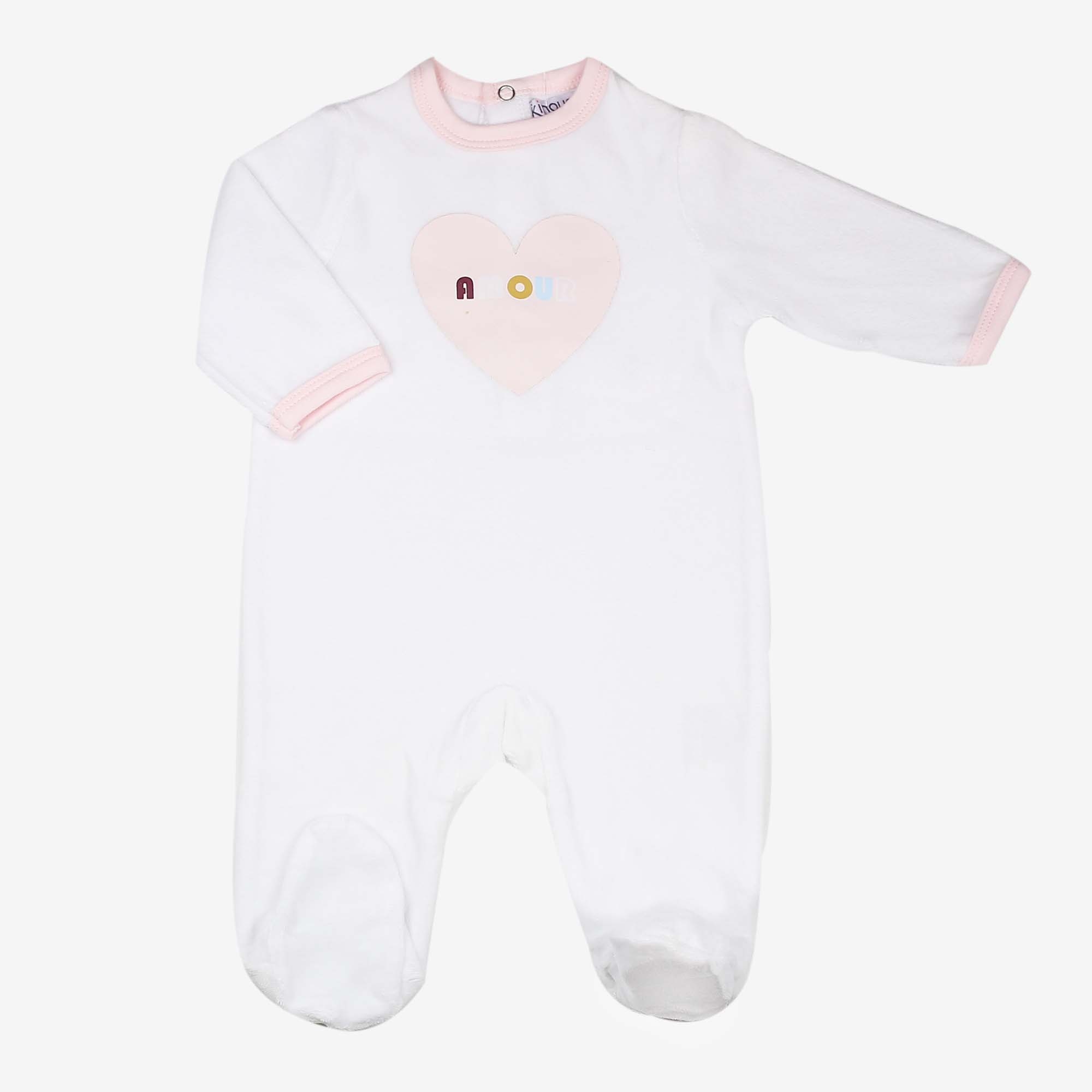 Ce pyjama est parfait pour les petites filles. Chaud et confortable, votre enfant pourra jouer librement. Ce pyjama bébé à pied se ferme dans le dos à l'aide de boutons pressions. Blanc uni, le col et les manches ont un petit liserés rose qui contrastera avec le petit coeur et le mot AMOUR présent dedans. Velours : 75% coton / 25% polyester - 220Gr