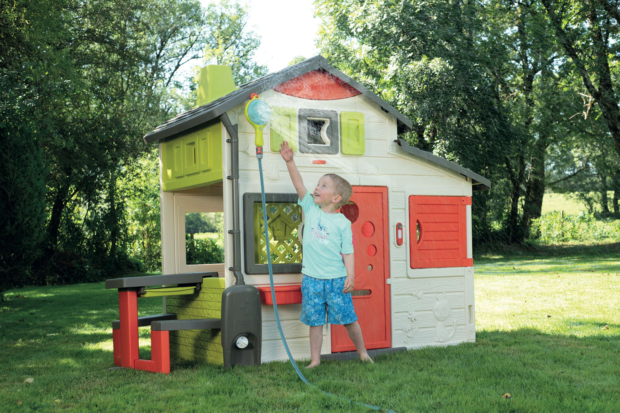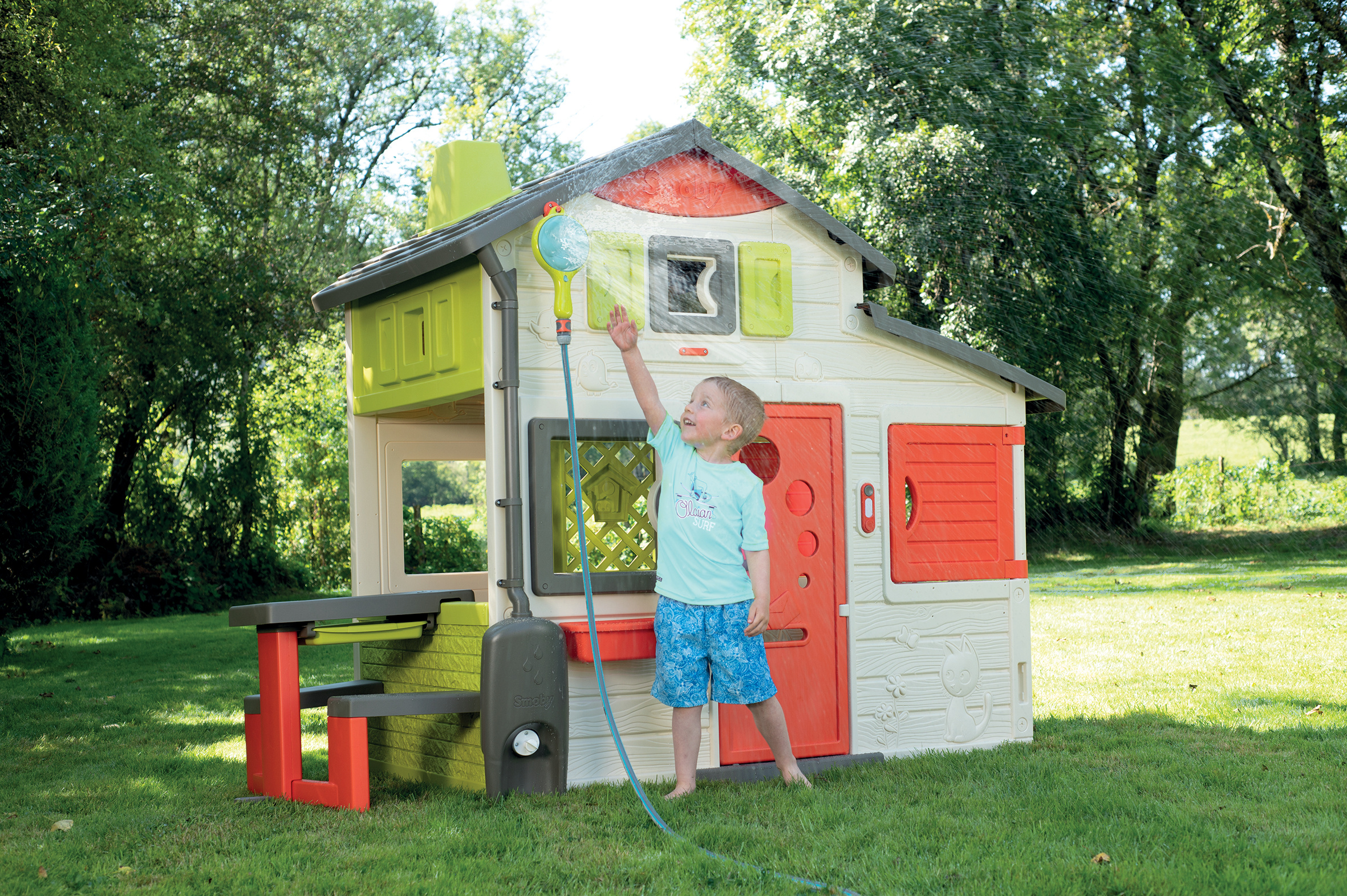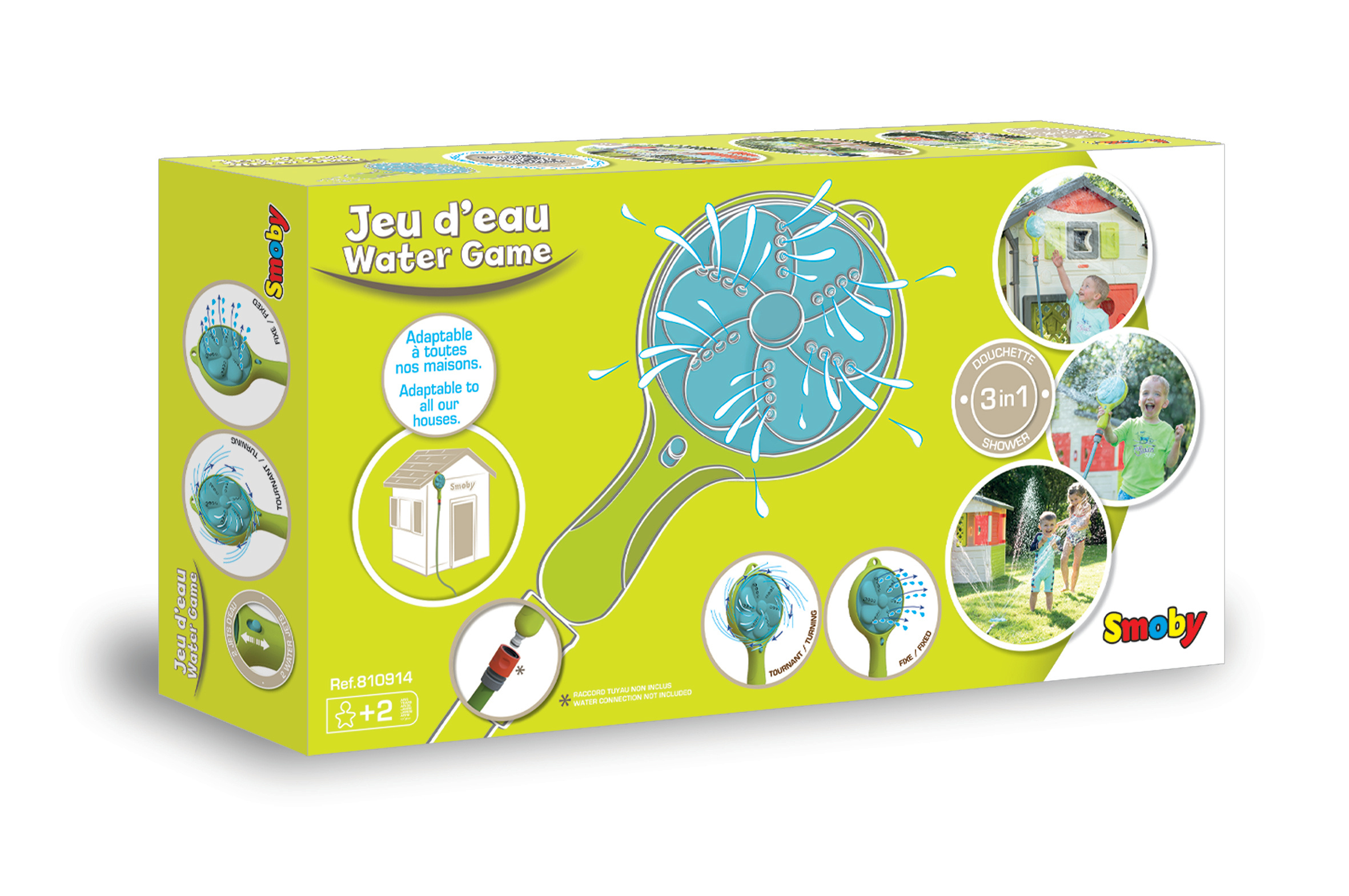 Douchette 3 en 1 pour rafraîchir les journées estivales : à poser au sol, à prendre à la main, ou à suspendre à sa maison. Avec un bouton pour régler le débit d'eau. Une pièce de fixation est incluse pour suspendre la douchette à sa maison (compatible avec toutes les maisons Smoby). Un raccord type Gardena permet de la relier à son tuyau d'arrosage (non inclus).