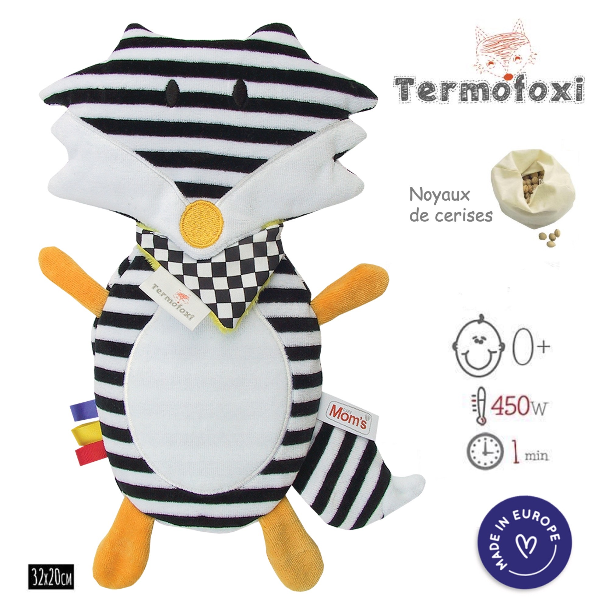 Doudou bouillotte sèche, TERMOFOXIL'adorable bouillote Renard Termofoxi va devenir le compagnon préféré de bébé et des parents! Un produit 3 en 1: peluche d'éveil extra douce + bouillotte qui soulage petits bobos + chauffage d'appoint nomade à emporter partout.AVERTISSEMENT: Chers parents, seul le sachet contenant les noyaux de cerises (la bouillotte) peut être mis au micro-ondes, pas la peluche. Vérifiez la température du Termofoxi avant de le placer en contact avec Bébé.La bouillotte n'est pas un jouet, ne laissez pas l'enfant sans surveillance avec le Termofoxi.INSTRUCTIONS:Réglez votre micro-ondes sur 450WChauffez le sachet pendant 1 minuteLa bouillotte écologique en noyaux de cerises diffuse une chaleur douceFabriqué en matériaux de qualité, ce joli renard est un véritable distributeur de chaleur. La peluche mettra tous les sens de Bébé en éveil de par ses couleurs vives, sa queue et son écharpe qui émettent un bruit de froissement lorsque Bébé les manipule.Multi-usage, le Termofoxi réchauffe et soulage votre enfant selon ses besoins. Le grand format de cette bouillotte écologique pour bébé est idéal pour des moments câlins réconfortants à la maison et en dehors.En plus d'être joli, le Termofoxi est toujours prêt à aider Bébé. Vous allez l'adorer pour son design mais aussi pour son aide au quotidien pour masser ou soigner votre enfant.Cette bouillotte pour bébé est idéale pour soulager:- coliques du nourrisson