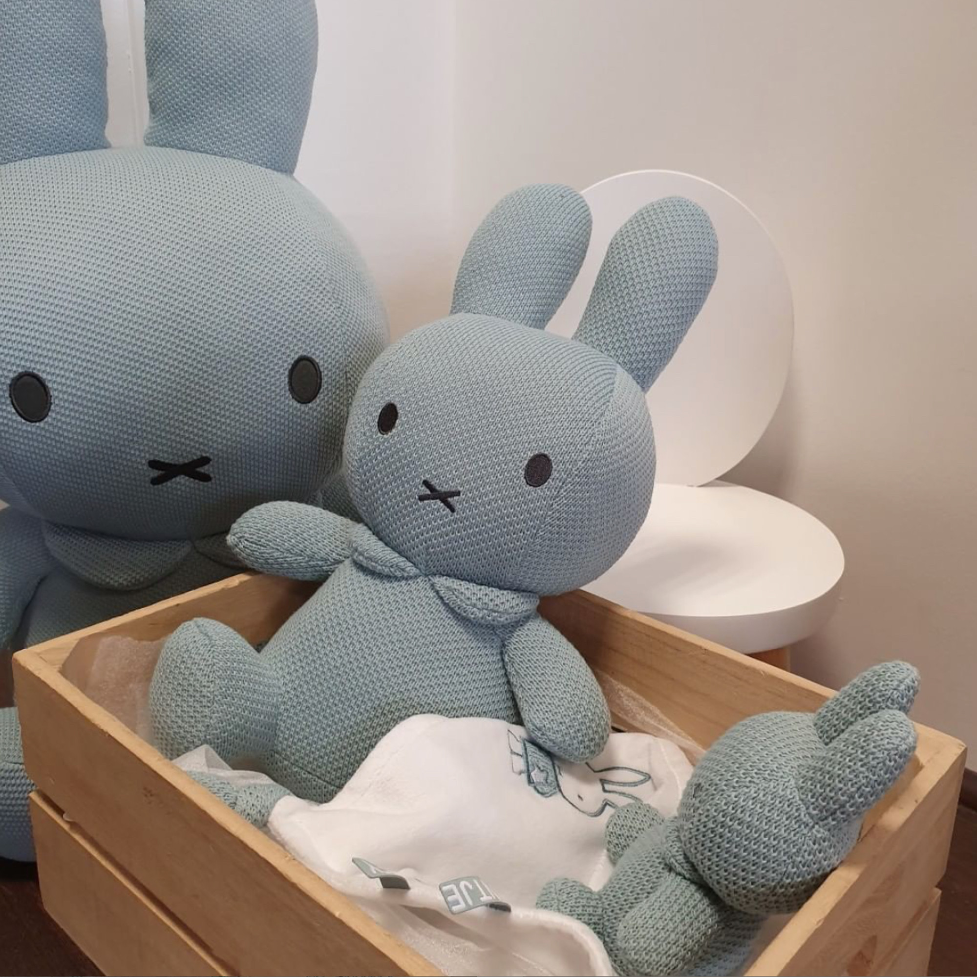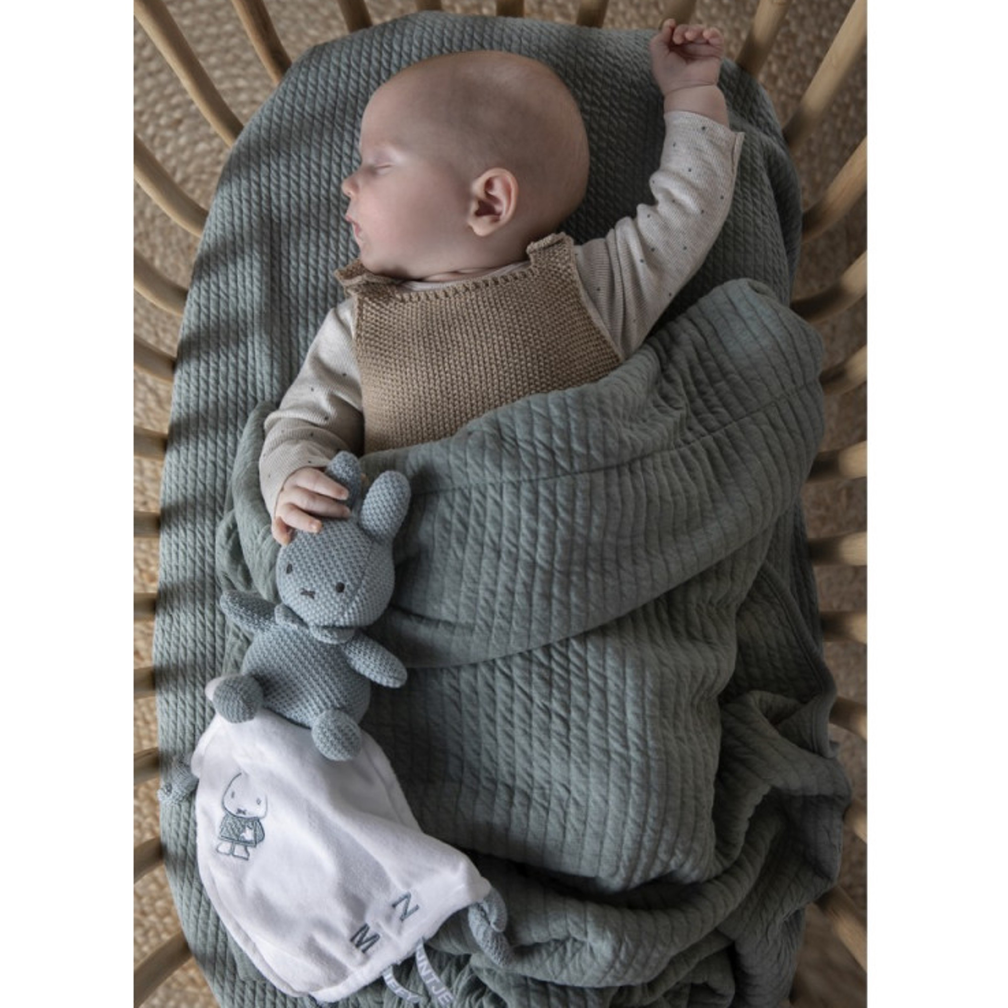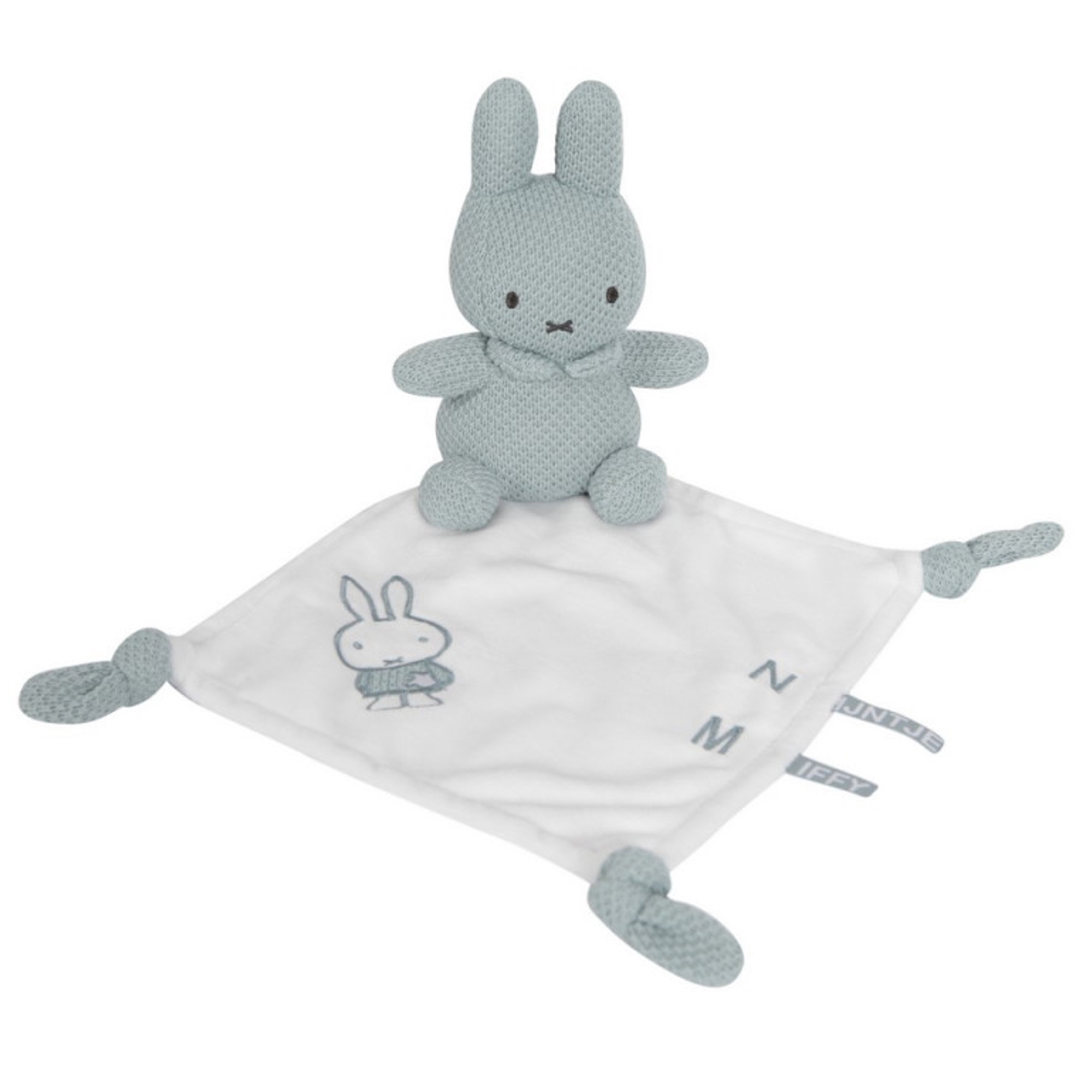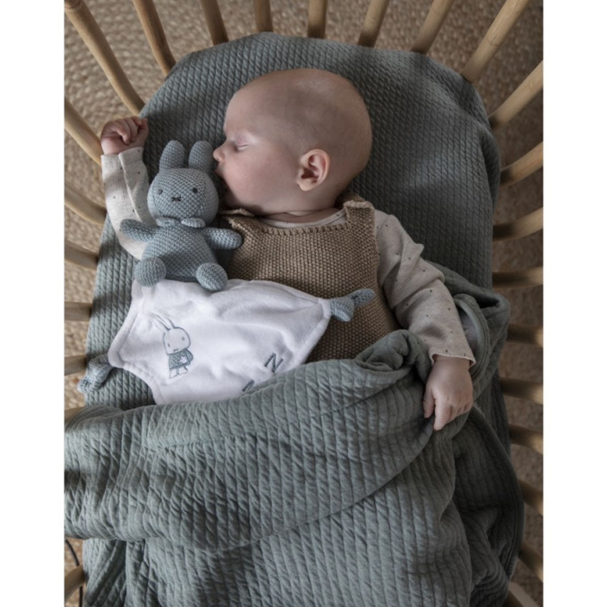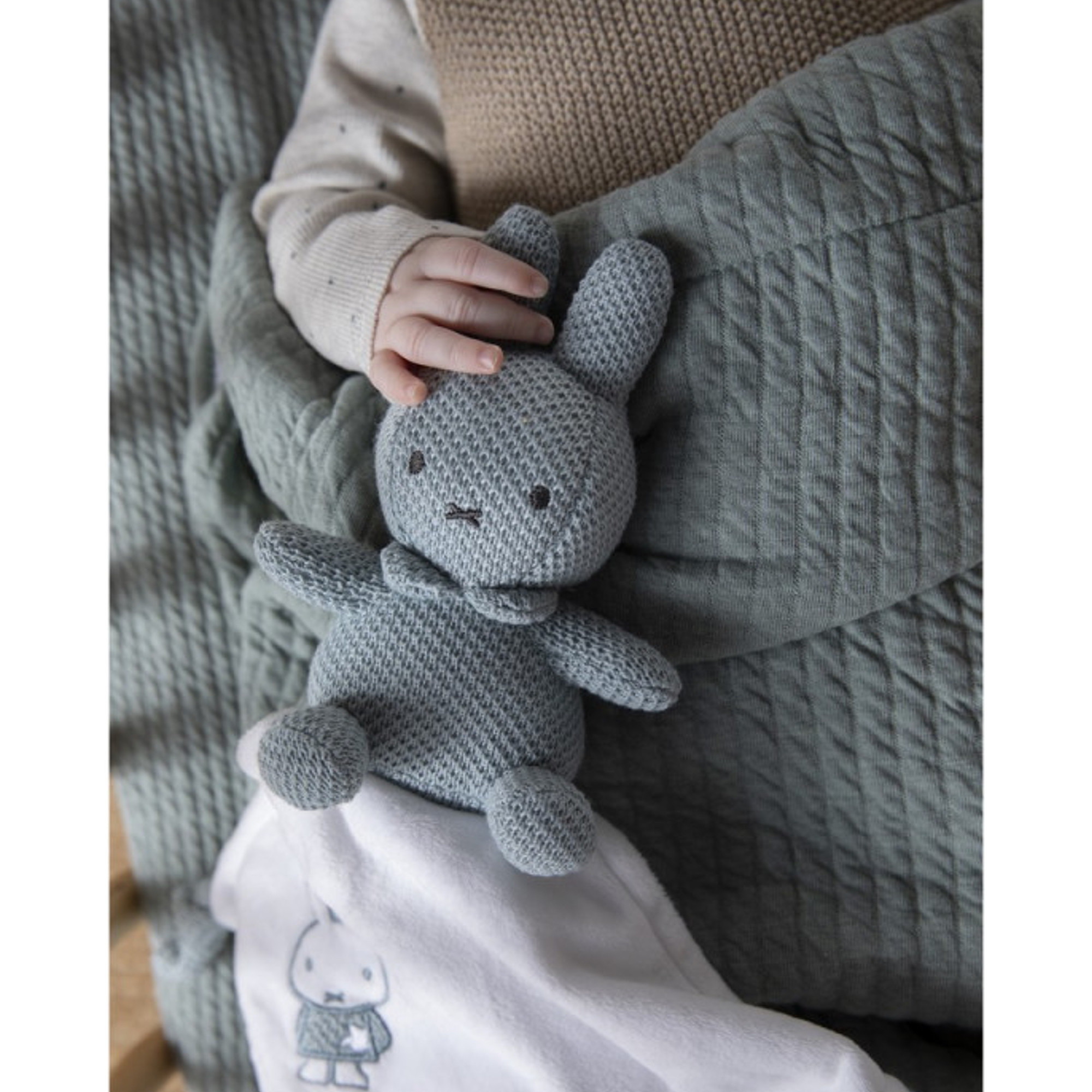 Miffy est la petite lapine héroïne des enfants, voici sa version doudou en tricot vert amande, pour donner un côté sophistiqué et épuré à la peluche.