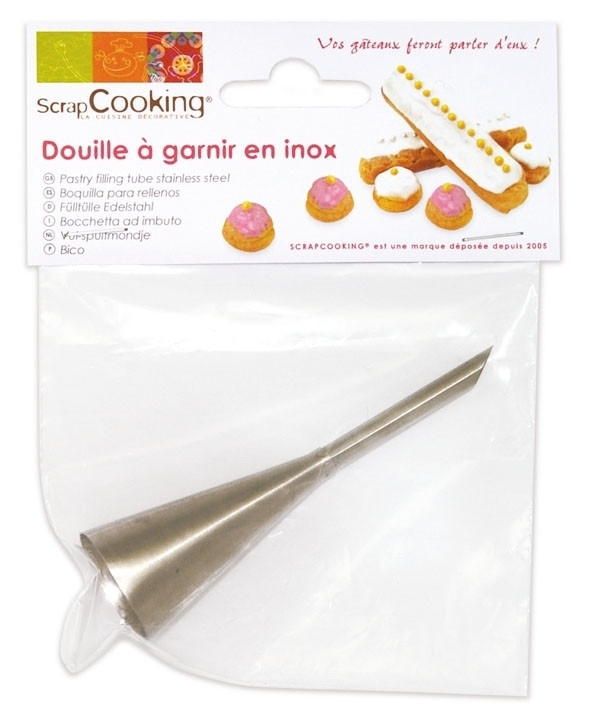 Douille inox pour garnir avec précision vos gâteaux et plus spécialement vos choux à la crème, à la chantilly ou vos éclairs. Son embout très fin et allongé vous permet de faire un petit trou invisible dans vos pâtisseries afin de les remplir de la crème de votre choix. Dimensions : Ø 0,5 x 2,4 x H7,4 cm Pour la nettoyer, un passage sous l'eau chaude suffit. Douille à garnir les choux en inox