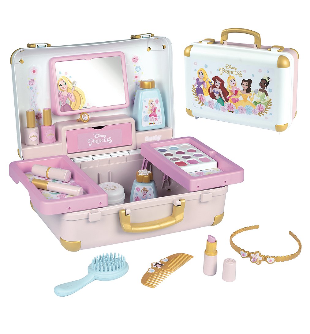 Valise beauté Disney Princess, compacte et facile à transporter avec 2 loquets et 1 poignée. Elle regroupe 3 univers : coiffure, onglerie, maquillage.