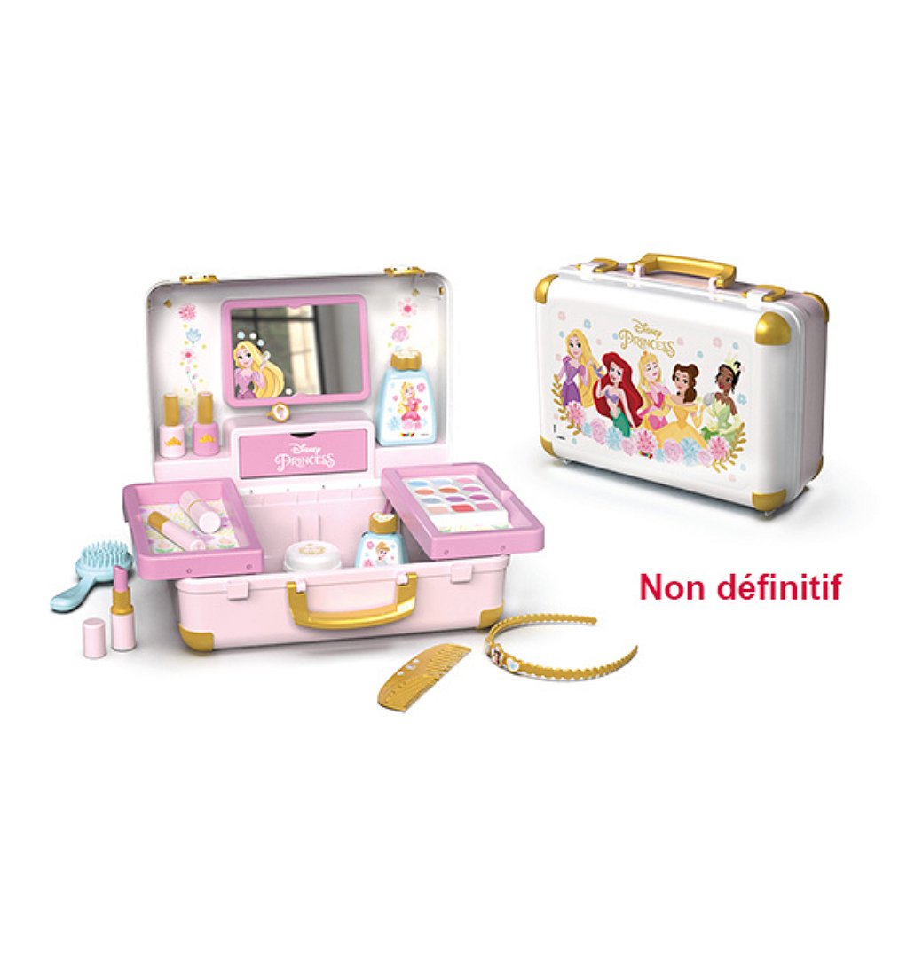 Valise beauté Disney Princess, compacte et facile à transporter avec 2 loquets et 1 poignée. Elle regroupe 3 univers : coiffure, onglerie, maquillage.
