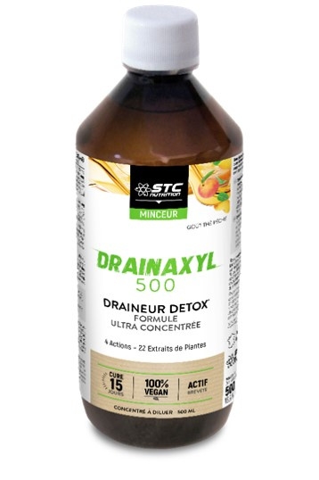 Drainaxyl® 500 STC Nutrition : le starter minceur quadruple action ! •Drainant - Détoxifiant •Thermogénique - Brûle-graisses •Digestion - Ventre plat •Circulation - Jambes légères Avant de démarrer toute cure de contrôle du poids, il est recommandé de « nettoyer » son organisme, de le drainer, pour favoriser l’élimination de l’eau et des toxines, afin que tous les métabolismes puissent fonctionner correctement. Drainaxyl® 500 STC Nutrition est le Starter Minceur idéal. Drainaxyl® 500 STC Nutrition est un complément alimentaire à base d'extraits de 22 plantes, reconnus pour leurs effets complémentaires : •Un actif breveté 100% d’origine naturelle, l’Elim’real® qui correspond à l’association de 6 plantes agissant en synergie et dont les effets sur l’activation du drainage et les bénéfices associés ont été cliniquement prouvés : Action sur l’élimination* : Fréquence : + 84% / Volume : + 44% •Les extraits de Bouleau et de Reine des prés sont des draineurs naturels, associés aux extraits de Piloselle, Chiendent et Pissenlit, ils facilitent les fonctions d’élimination de l’organisme. •Les extraits de Pissenlit, Verge d’or, Bouleau, et Piloselle, avec les extraits d’Artichaut, et de Chiendent ont un effet détoxifiant en stimulant l’élimination de l’eau et des toxines. •Les extraits de Thé vert, Maté et Guarana aident au contrôle du poids et, en complément de mesures diététiques, favorisent l’amincissement. •Les extraits de Fenouil, Carvi et Romarin, en association avec les extraits de Chardon-Marie et Gingembre participent à la digestion •Les extraits de Carvi, Fenouil et Menthe sont reconnus pour aider à limiter les inconforts digestifs tels que les ballonnements. •L’ajout d’extraits de Vigne rouge, Hamamélis et Mélilot favorise une bonne circulation. * Effet constaté pour 805 mg / j d’Elim’real® (soit un bouchon de Drainaxyl® 500 / j) Conditionnement : Flacon de 500 ml - Concentré à diluer - Cure de 15 jours - Goût Fruits rouges ou Thé pêche
