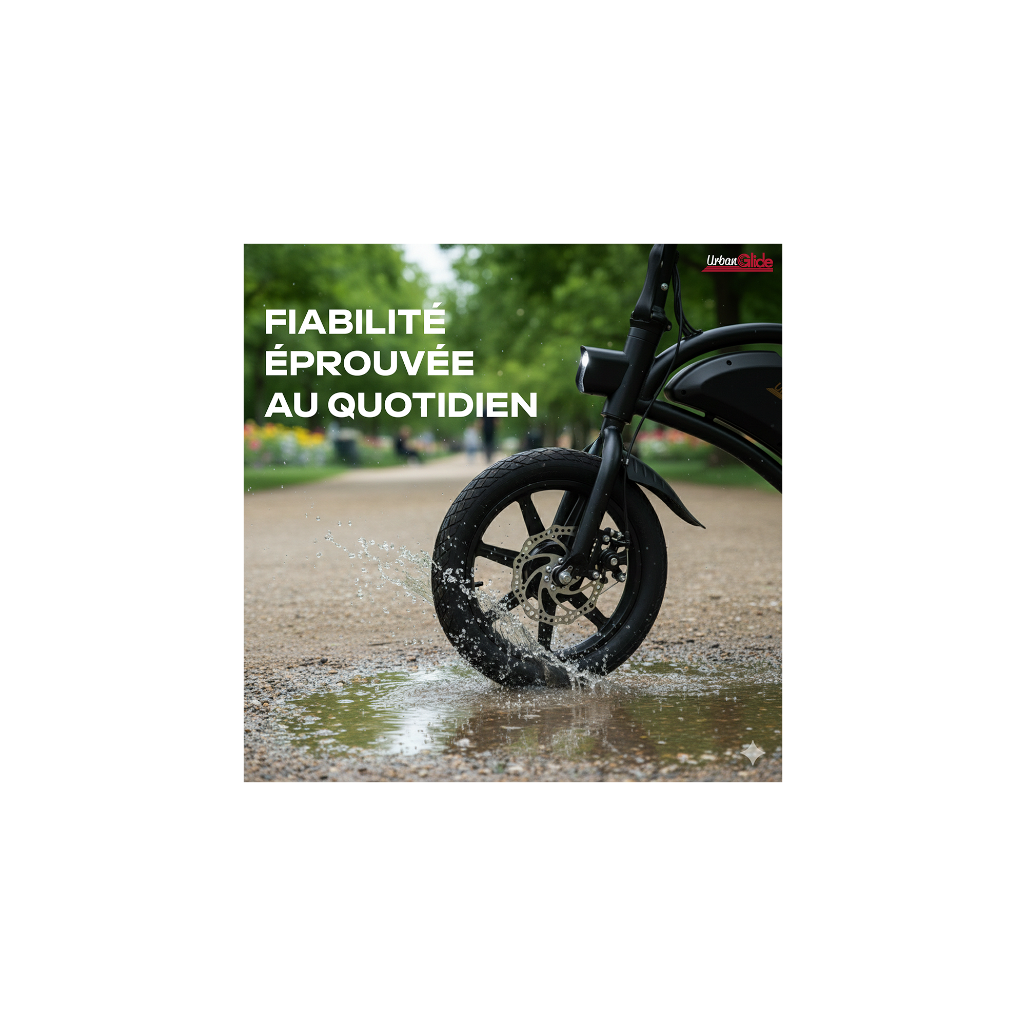 Son cadre en métal supporte jusqu'à 120 kg. Le système pliable facilite le rangement et le transport. Les garde-boue, la béquille et l'indice IPX4 complètent l'équipement pour un usage urbain fiable