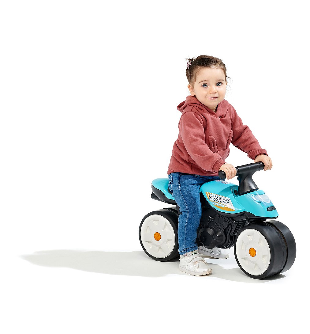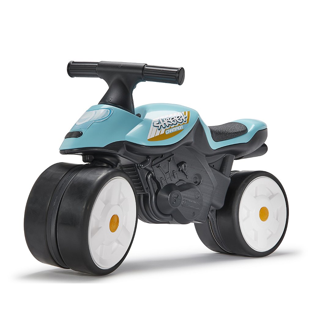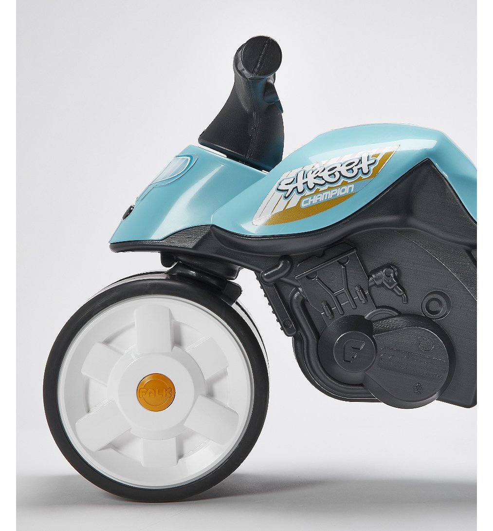 Moto Street Champion bleue avec roues silencieuses et guidon directionnel - 100% Made in France, composé à 40% de plastique recyclé dès 12 mois.
