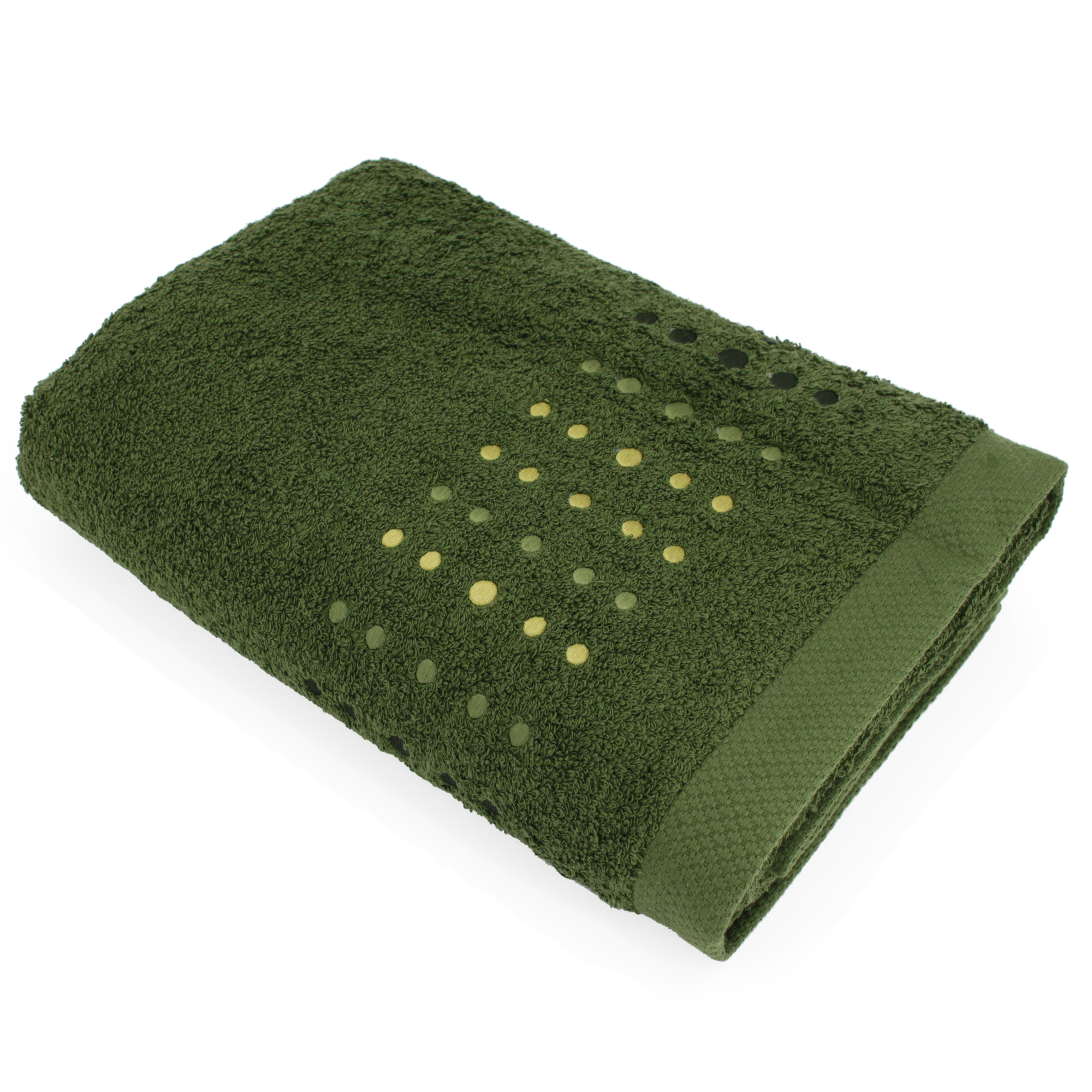 | Plus produit | Drap de bain 100x150 cm PURE POINTS, éponge 100% coton 550 g/m2, broderies - Vert Kaki - Fabriqué au Portugal |