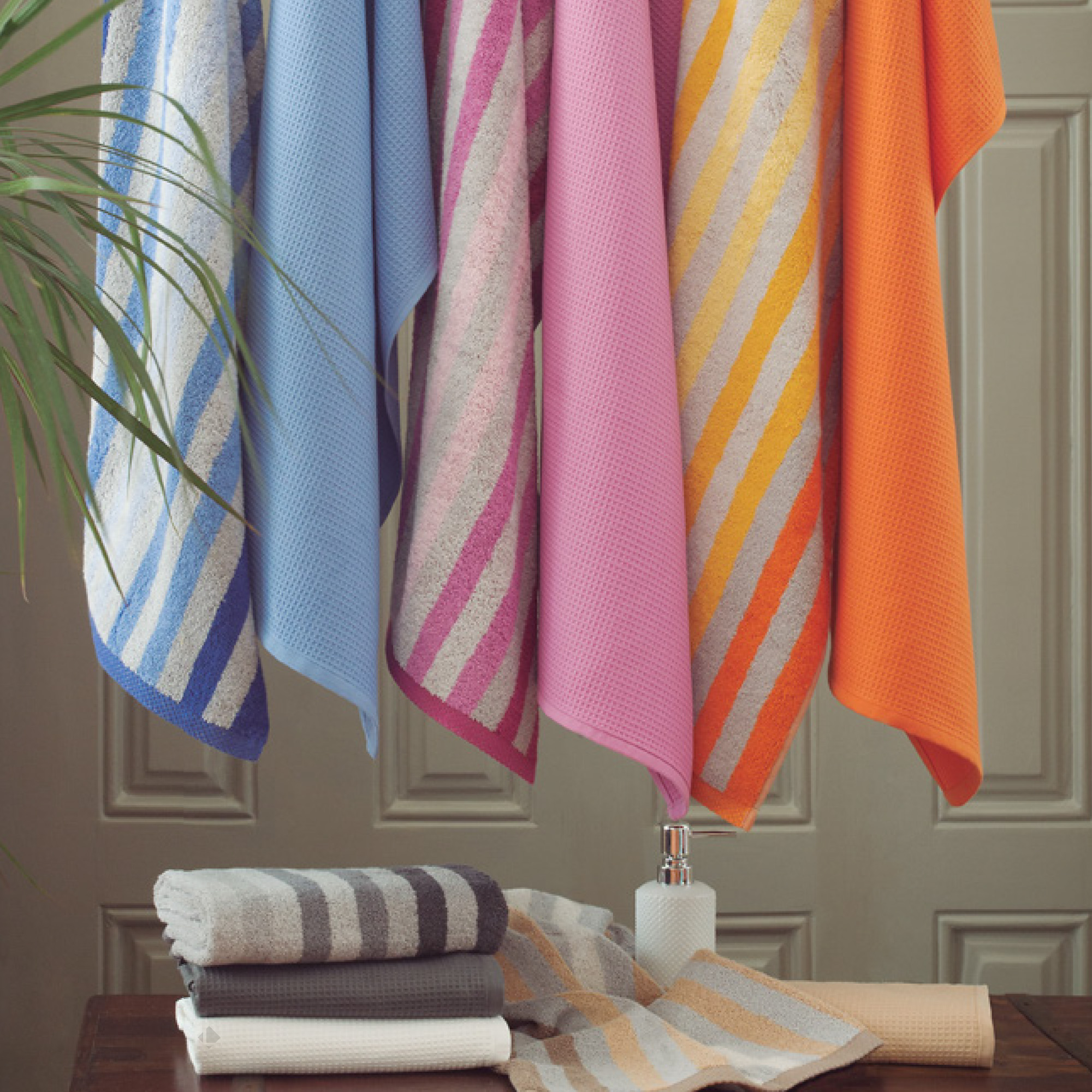 - Collection PURE STRIPES disponible en drap de bain 100x150cm, drap de douche 70x140cm, serviette de toilette 50x100cm, serviette invité 33x50cm et gant de toilette 16x21cm. Articles vendus séparemment ou en parure.
