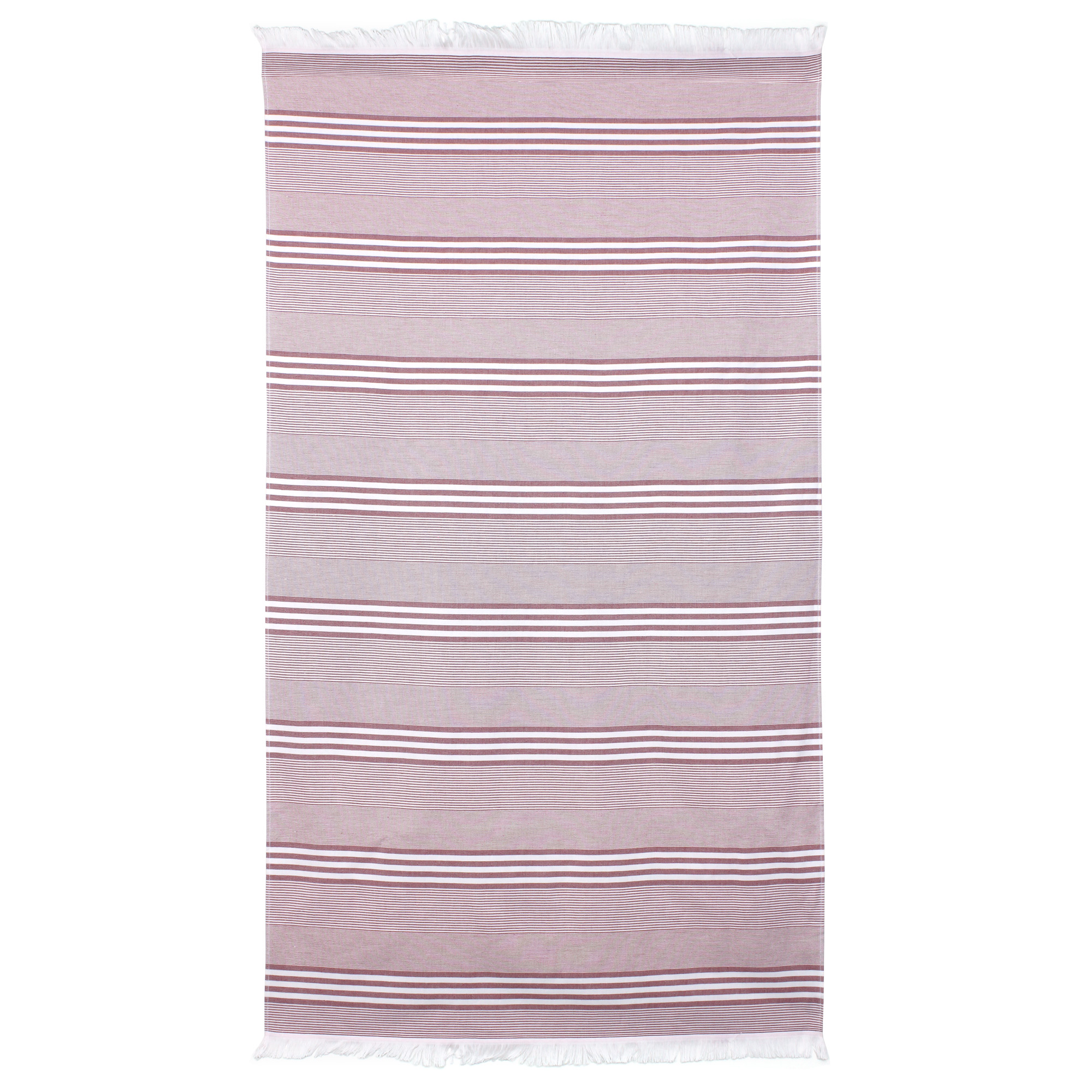 Ambiance bord de mer avec ce drap de plage dans des tons de rouge et ses rayures alternées fines et épaisses.