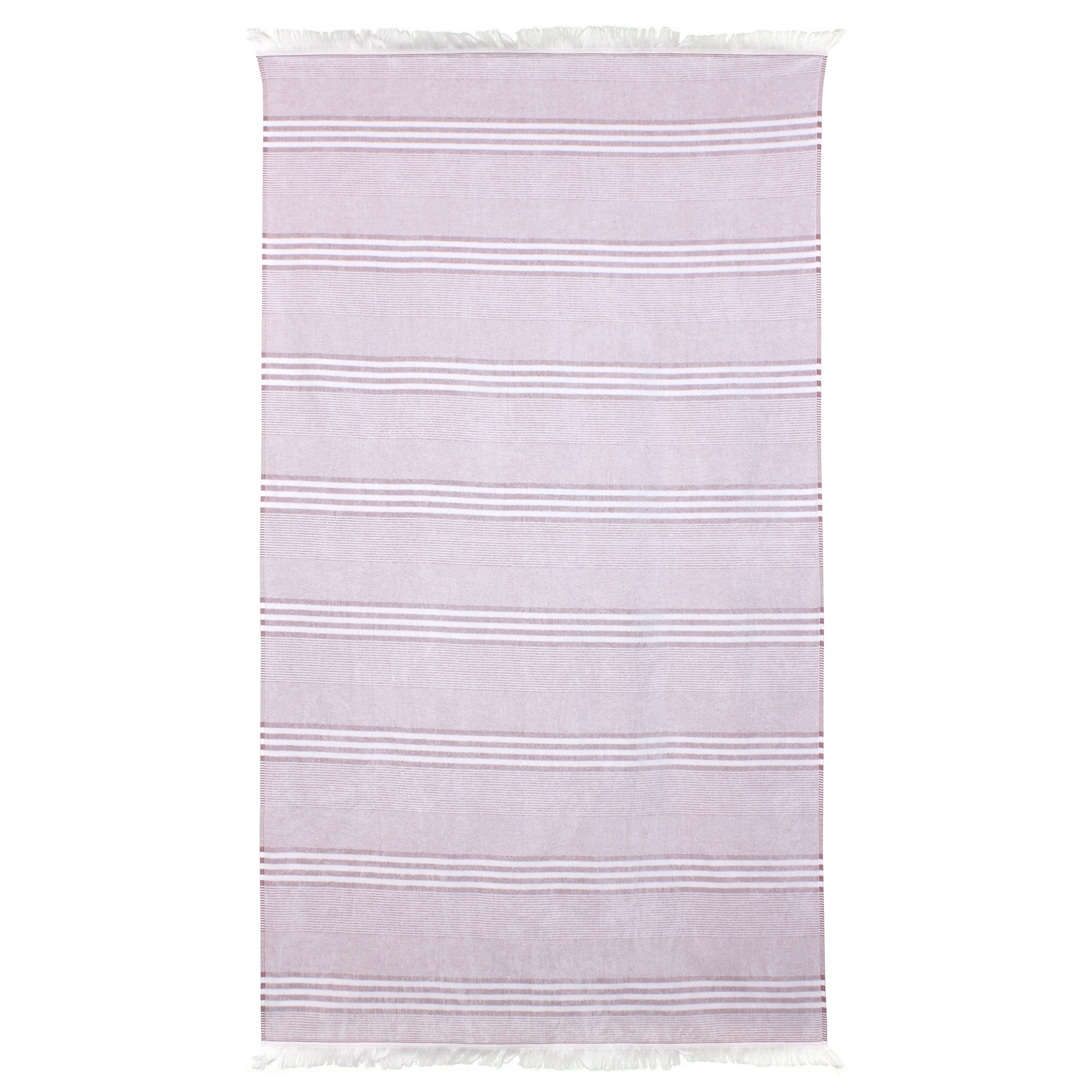 La qualité d'un drap de plage avec une face toile et une face bouclette éponge, et l'avantage de la fouta par sa légéreté, avec finition frangée aux extrémités.