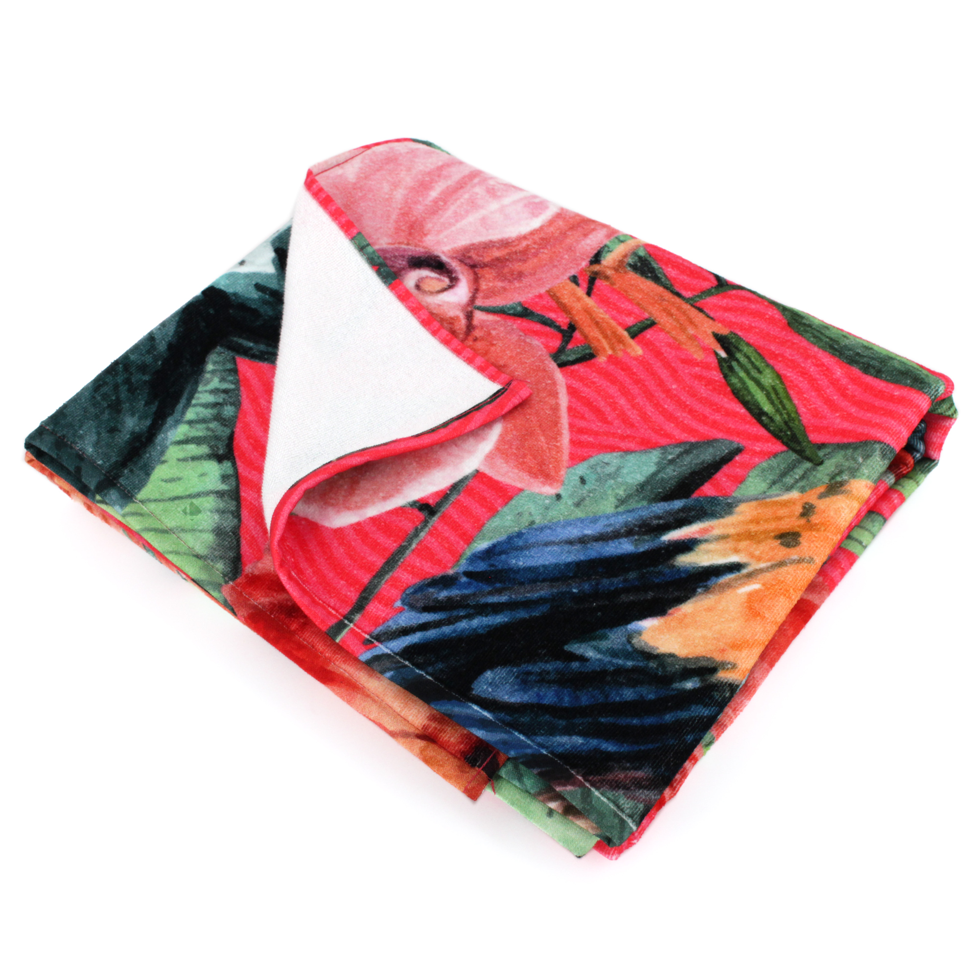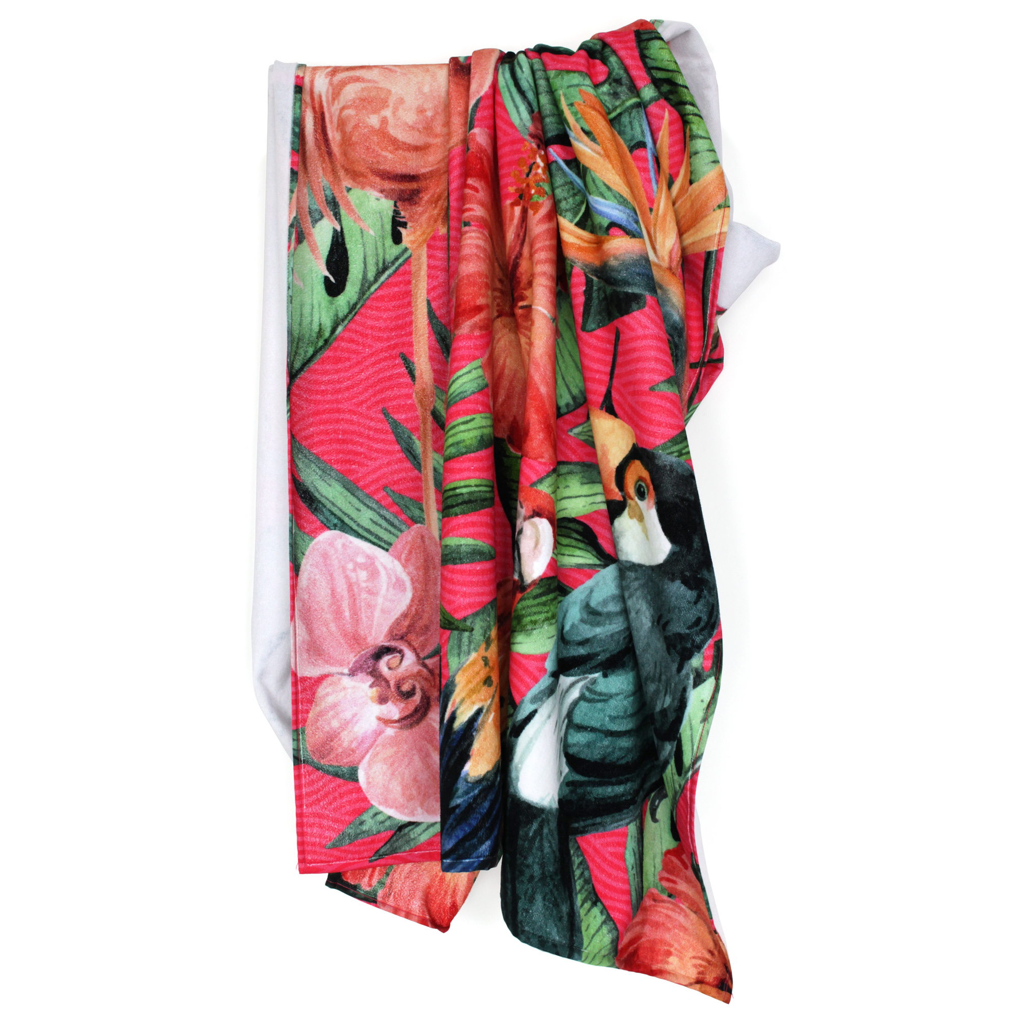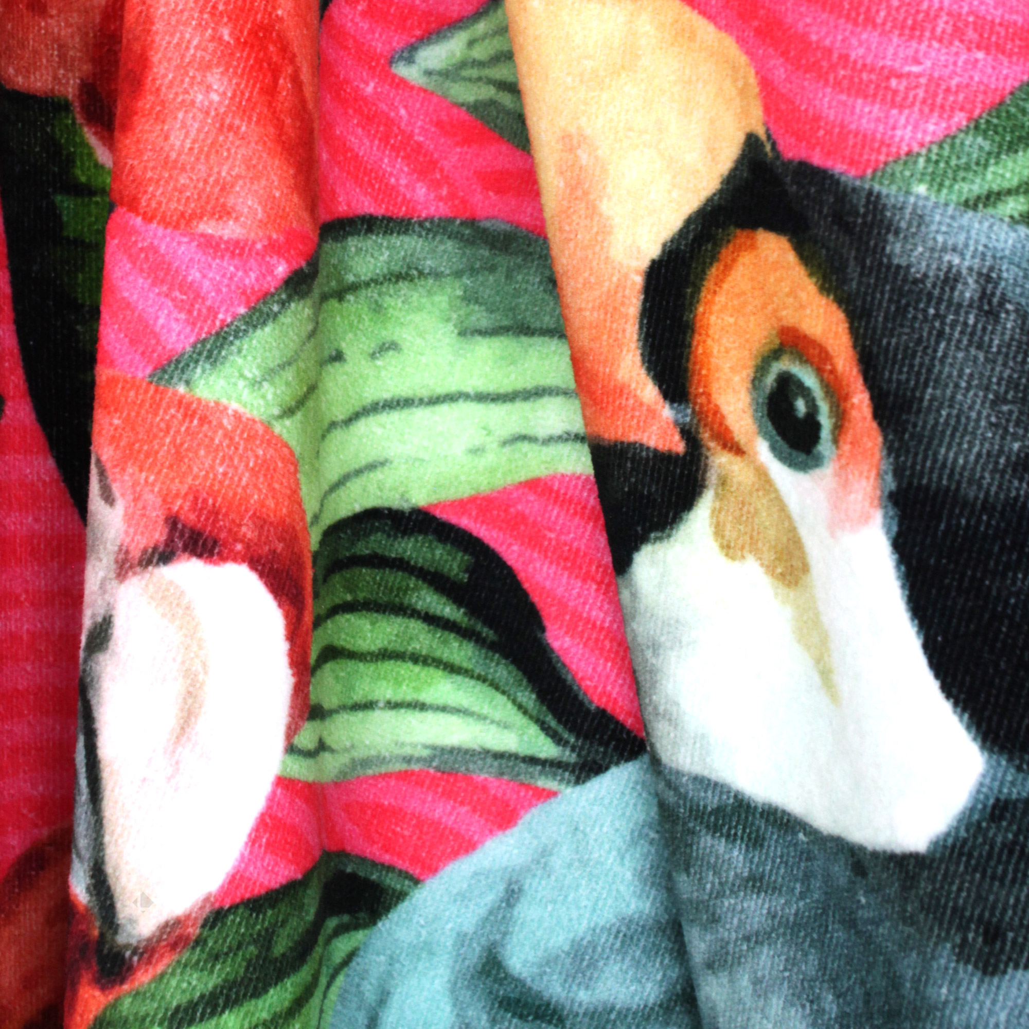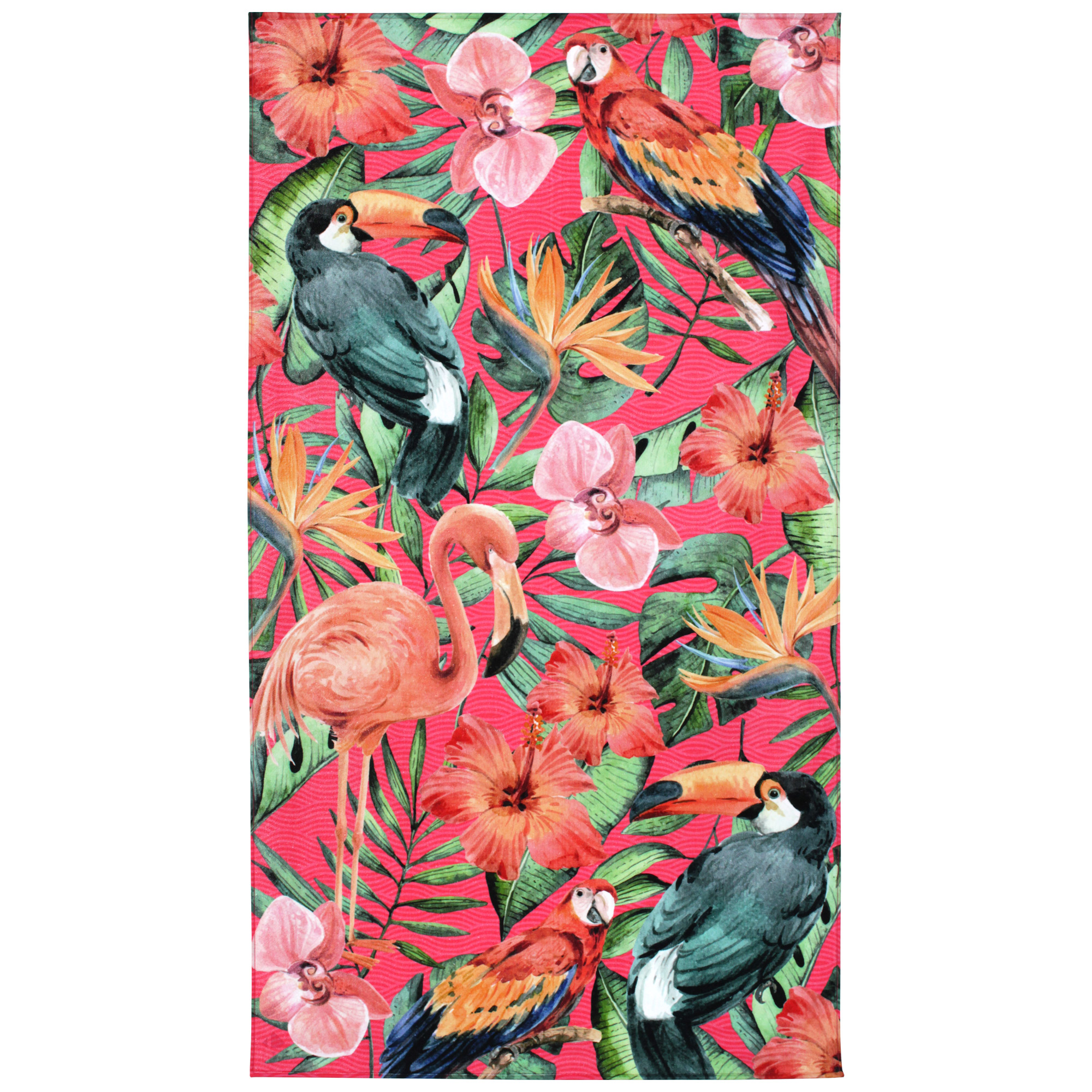 Superbe drap de plage avec une impression numérique haute de gamme composée d'un motif d'oiseaux, perroquets, toucans et flamant rose sur fond végétal dans des tons de rose. Très coloré, parfait pour vous accompagner à la piscine, à la plage et vous détendre.