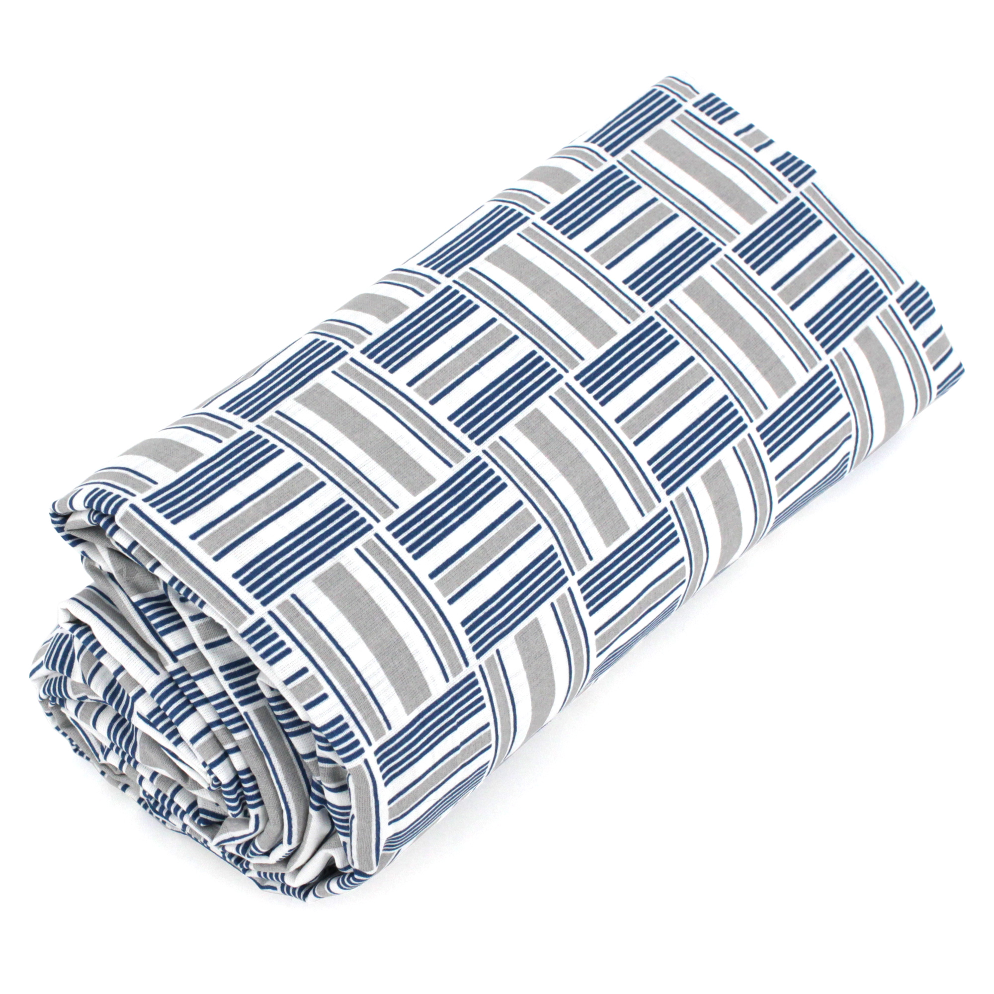 Imprimé all-over de motifs caillebotis dans des tons de bleu et gris sur fond blanc. Grand bonnet de 30cm et élastiques aux 4 coins pour un maintien parfait.