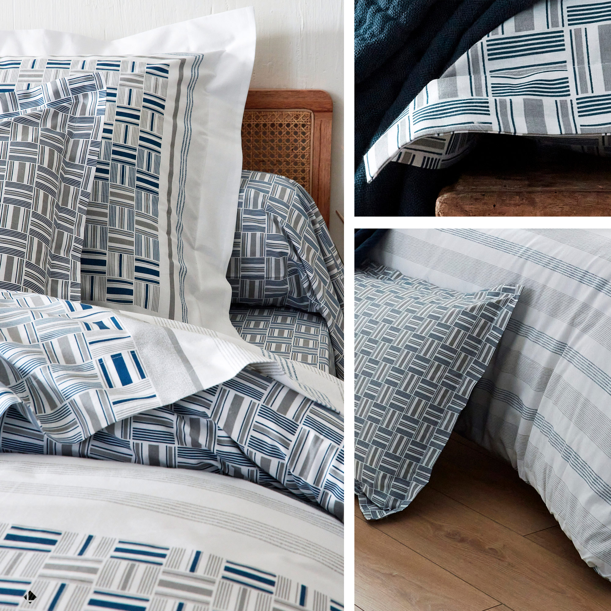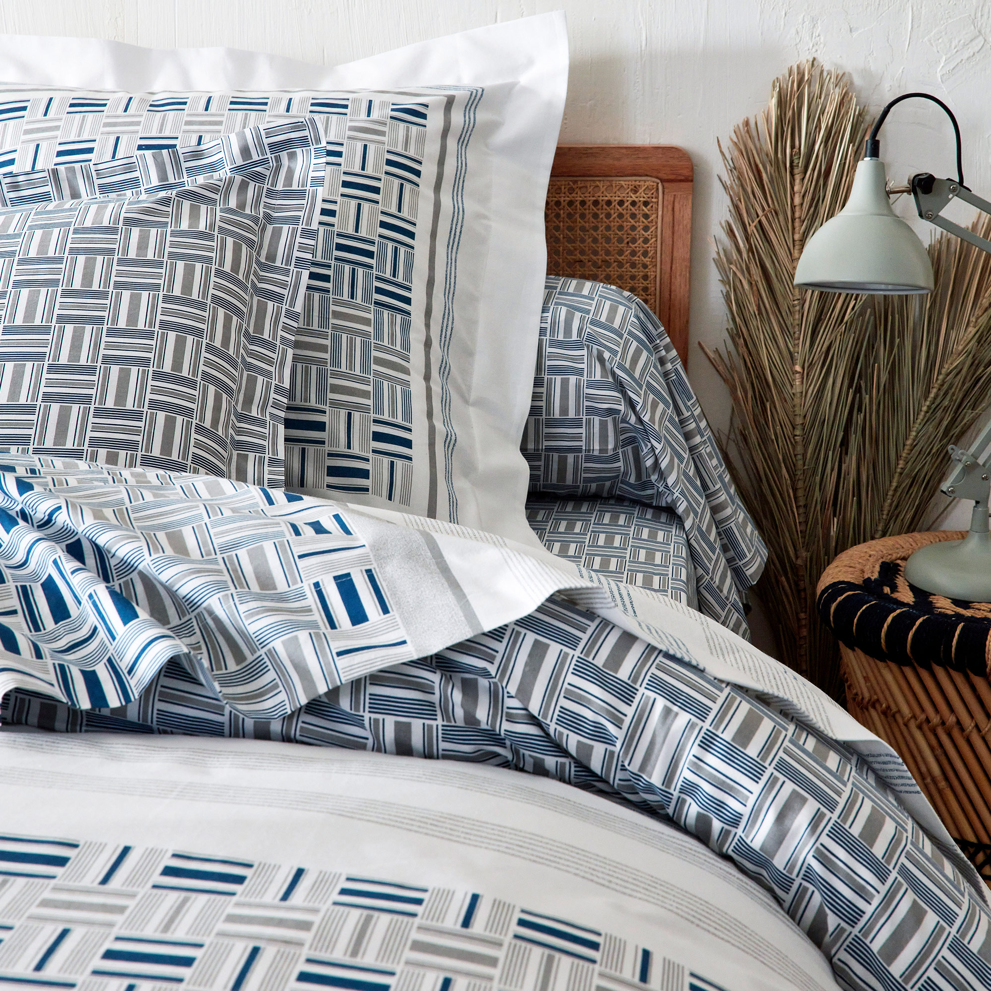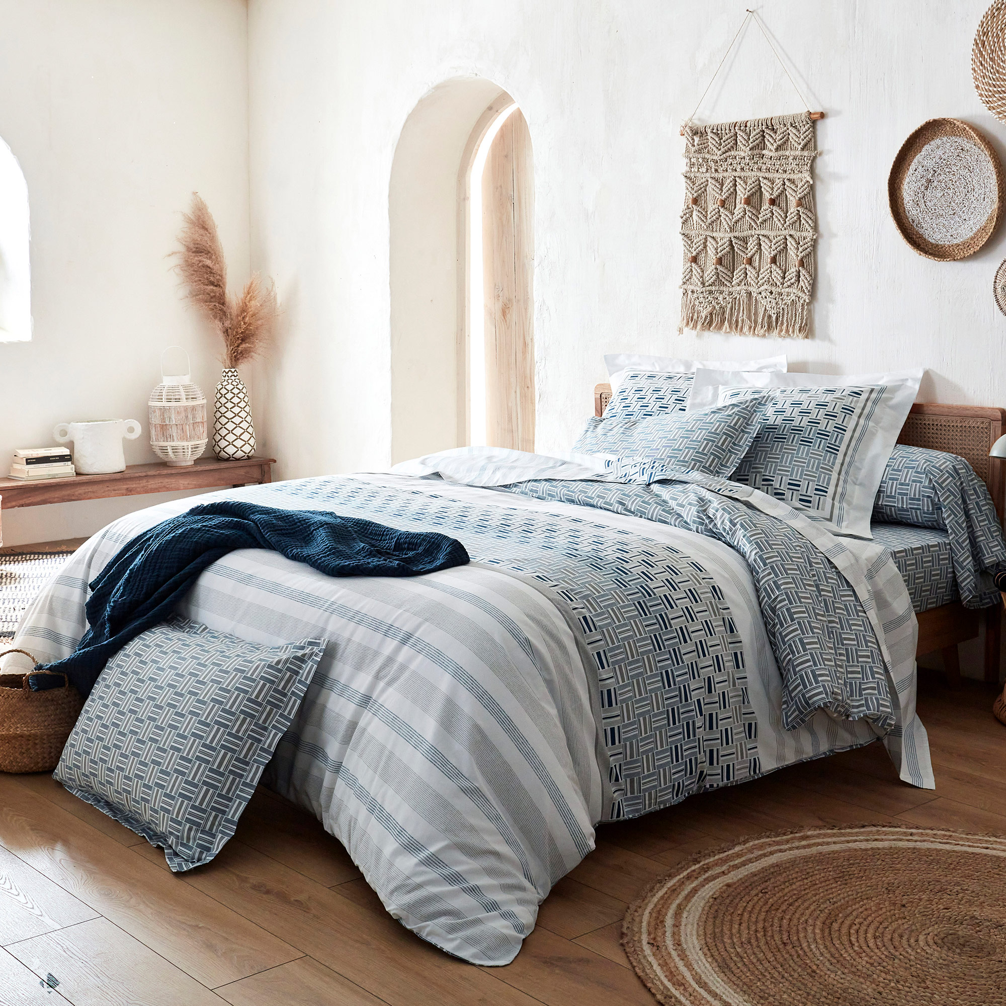 Ambiance ethnique pour cette parure de lit avec des motifs imprimée de fines rayures et caillebotis dans des tons de bleu et gris sur fond blanc.