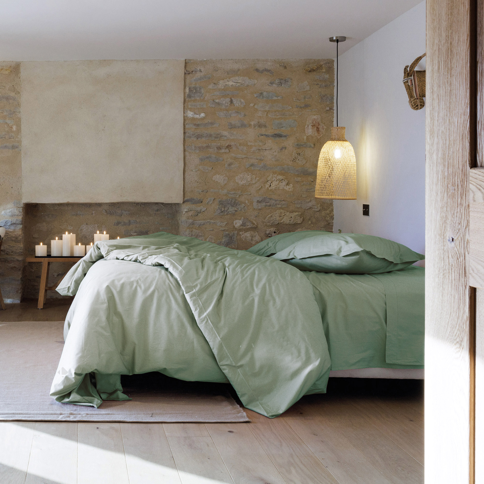 | Plus produit | Drap housse 200x200 cm bonnet 40 coloris vert Lichen uni, collection MANOIR 100% percale de coton tissage 80 fils/cm2 très serrés, doux au toucher, respirant et très résistant |
