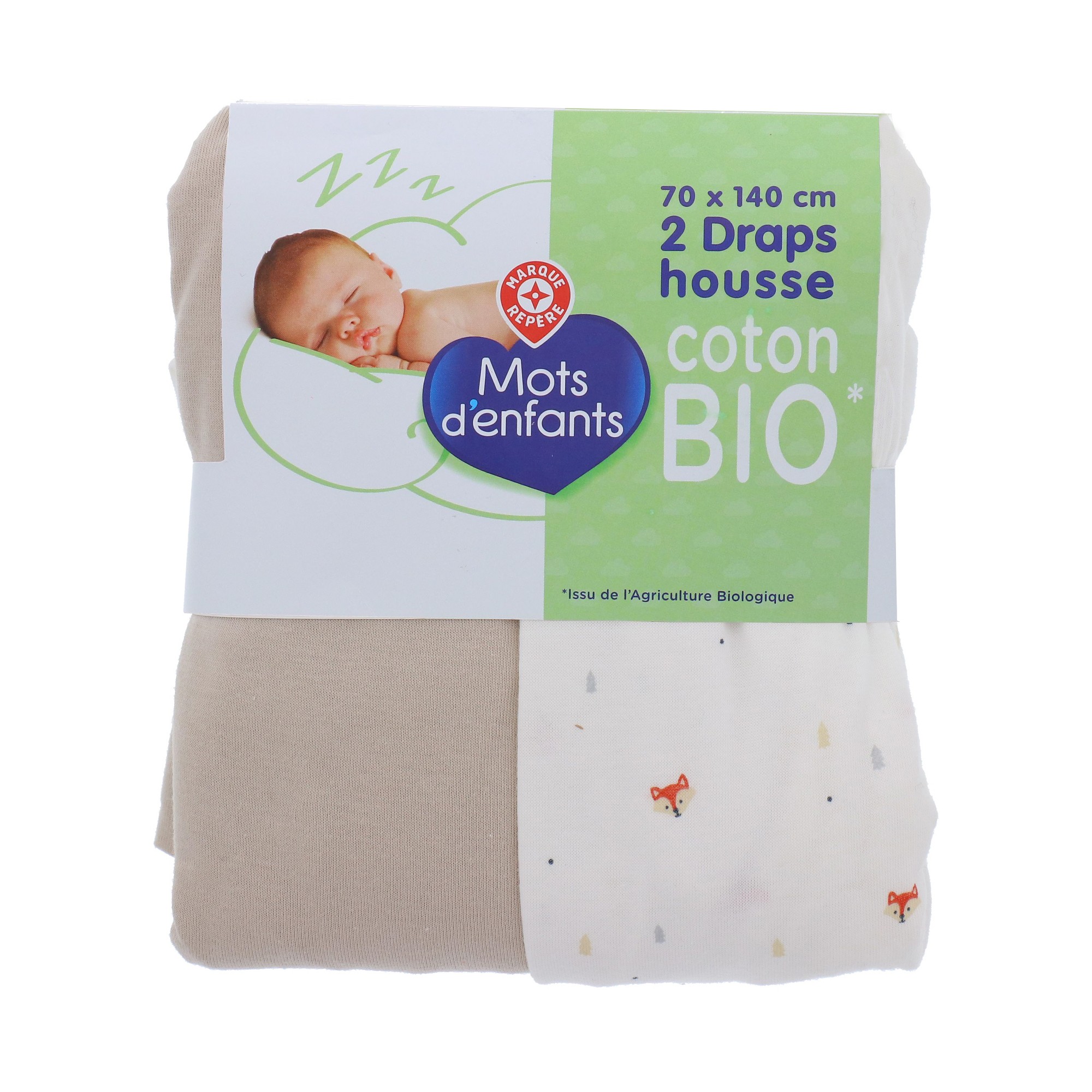 | Libellé | Draps housse lit bébé - Mots d'enfants - 2 draps housse imprimés 70 x 140 cm, 100% coton issu de l'agriculture biologique |