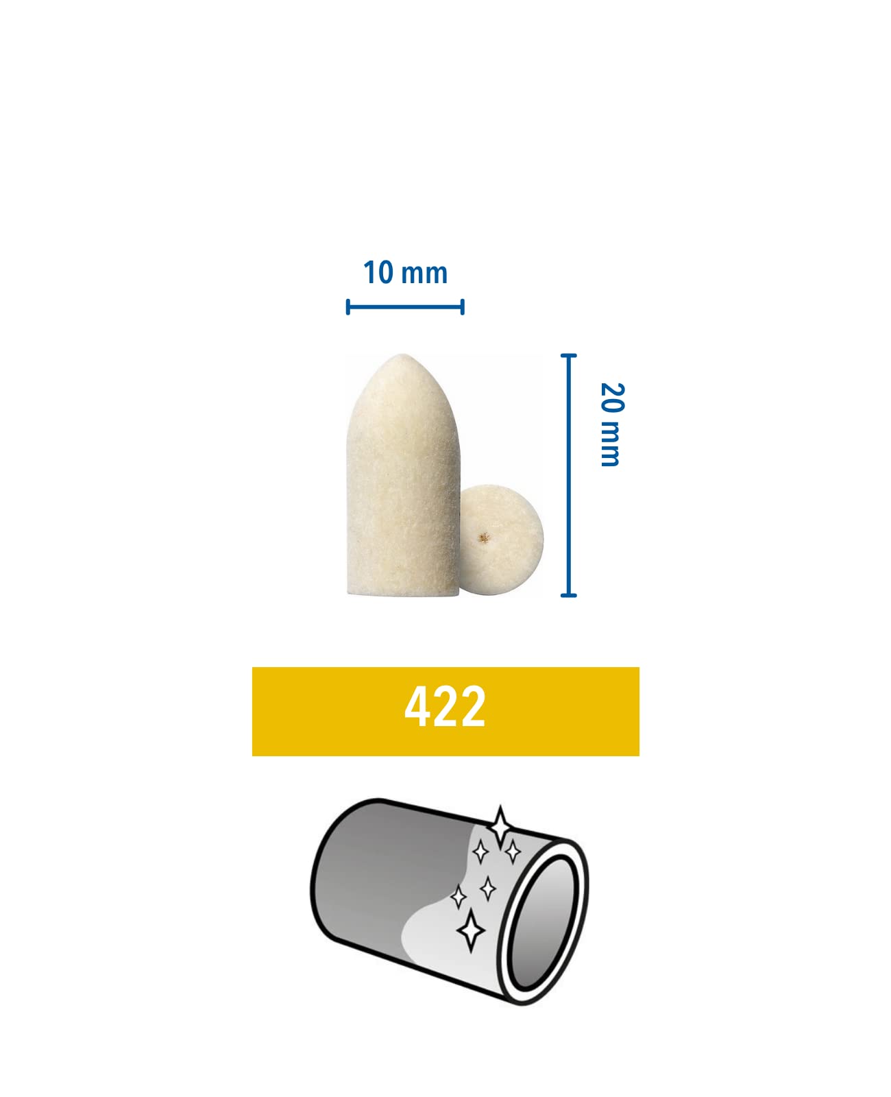 Idéal pour le polissage du plastique et des métaux. Associer la pâte à polir N° 421 aux bâtons pour obtenir un lustrage incomparable. Utiliser les références 414, 422 et 429 avec le mandrin 401. Utiliser la référence 425 avec le mandrin 402.; Diamètre de la queue : 3,2mm et diamètre de travail : 10mm. Forme en pointe. Vitesse de rotation maximale : 20.000 tr/min.;Matériaux compatibles : aluminium, laiton, cuivre, or, acier durci, plastique, plexiglas, argent, métaux tendres (ne contenant pas de fer), inox, tôle, plastique renforcé de fibre de verre et acier;Contenu : 4 x bâtons de polissage 422;Compatible avec tous les outils multi-usages Dremel : 200, 300, 3000, 395, 398, 400, 4000, 4200, 4250, 4300, 7700, 7750, 7760, 8000, 8100, 8200, 8220, 8240, 8260, Fortiflex (9100), Micro (8050), Stylo+ (2050)