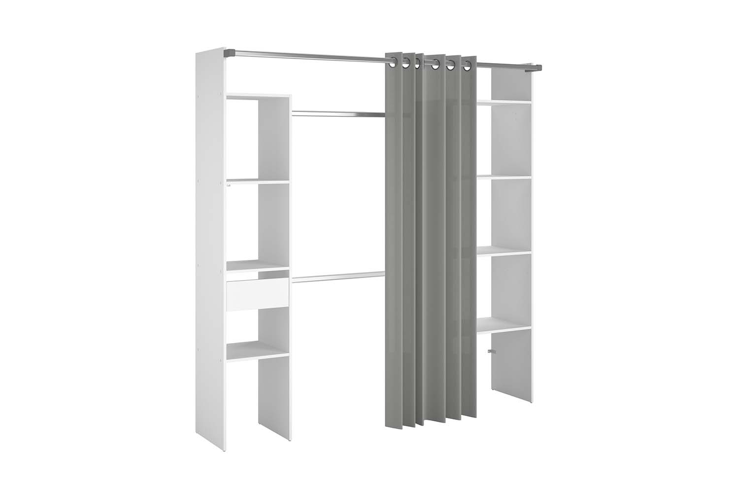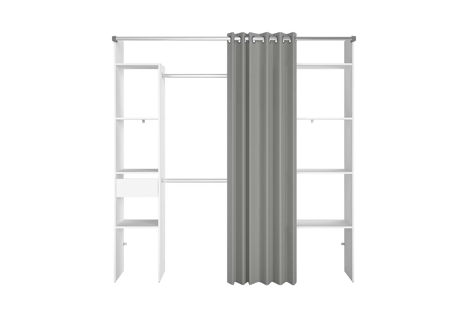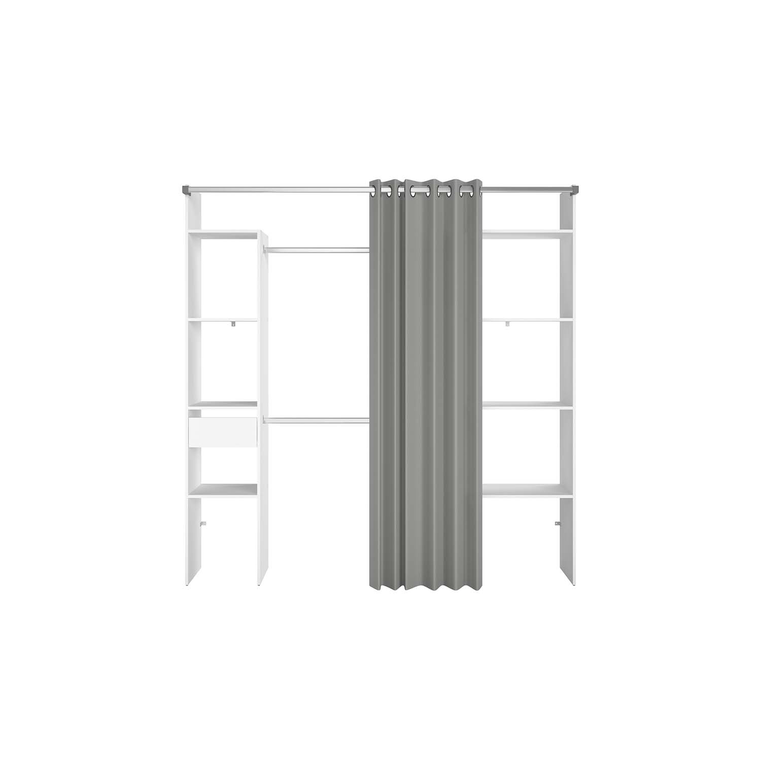Dressing blanc avec rideau gris et 2 penderies, 6 etagères et un tiroir