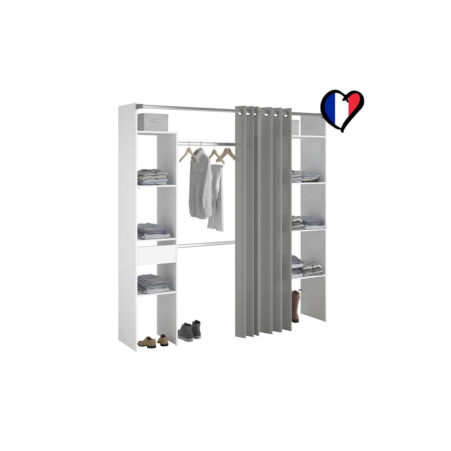 Dressing blanc avec rideau, étagères, penderies, tiroir ELYSEE