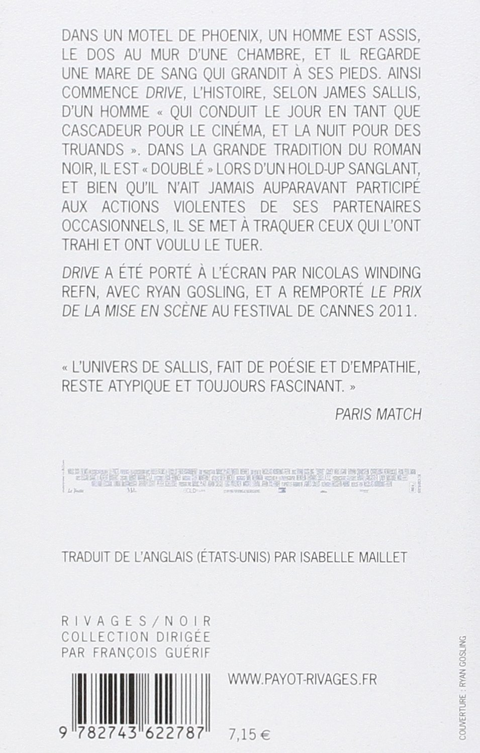 Dans un motel de phoenix, un homme est assis, le dos au mur d'une chambre, et il regarde une mare de sang qui grandit à ses pieds. Ainsi commence Drive, l'histoire, selon James Sallis, d'un homme « qui conduit le jour en tant que cascadeur pour le cinéma, et la nuit pour des truands ». Dans la grande tradition du roman noir, il est « doublé » lors d'un hold-up sanglant, et bien qu'il n'ait jamais auparavant participé aux actions violentes de ses partenaires occasionnels, il se met à traquer ceux qui l'ont trahi et ont voulu le tuer.