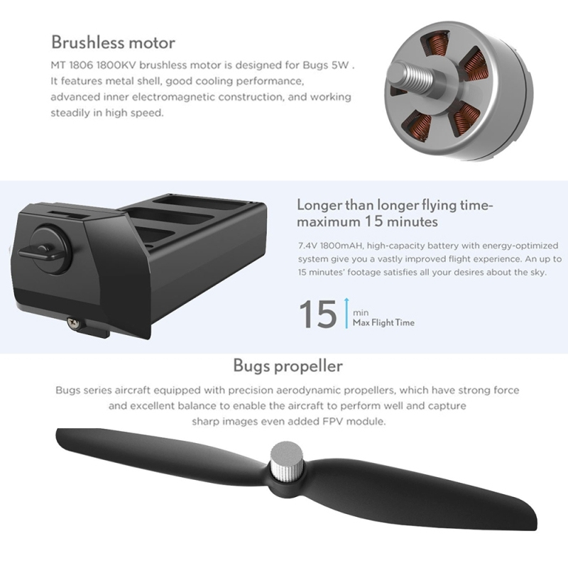 - Fonctionnalités : Mode de maintien d'altitude, mode sans tête, retour par une touche, positionnement GPS, connexion wifi FPV, GPS, APP, mode Fly-points
