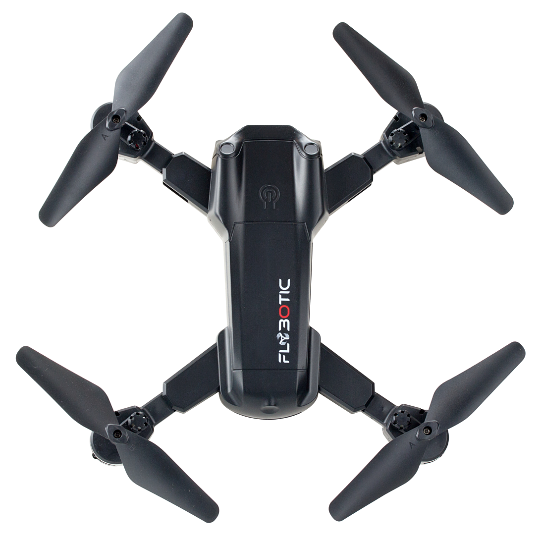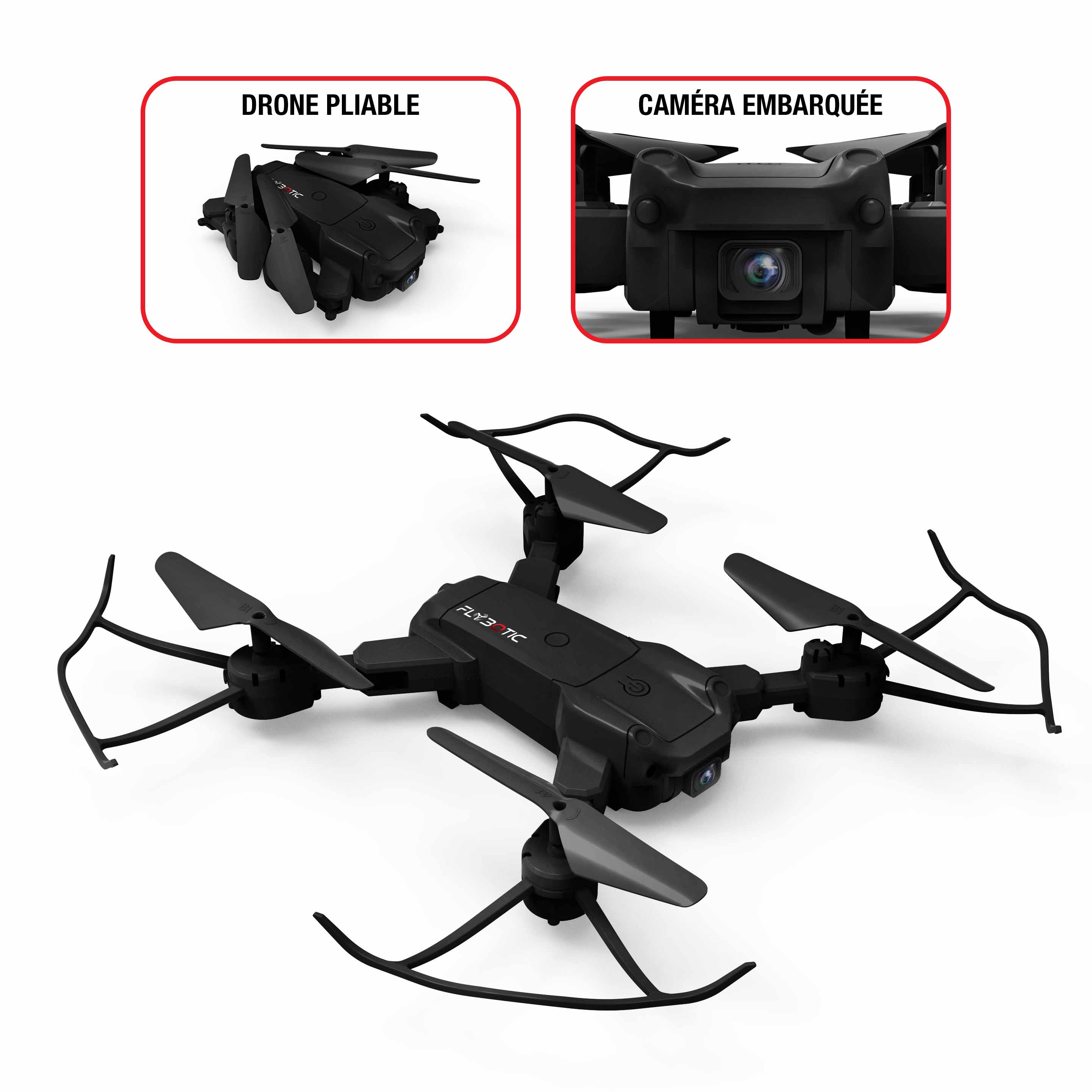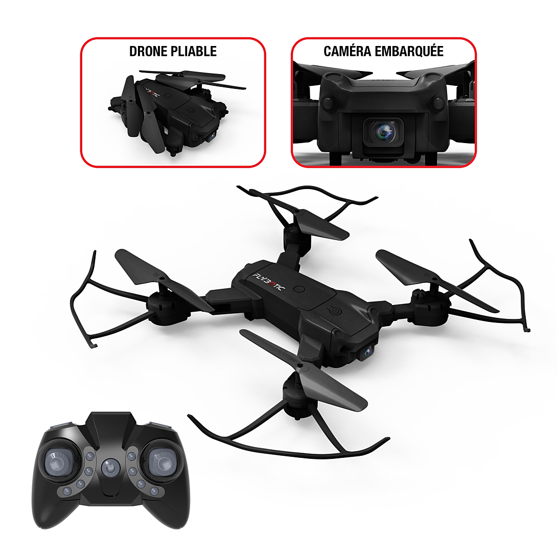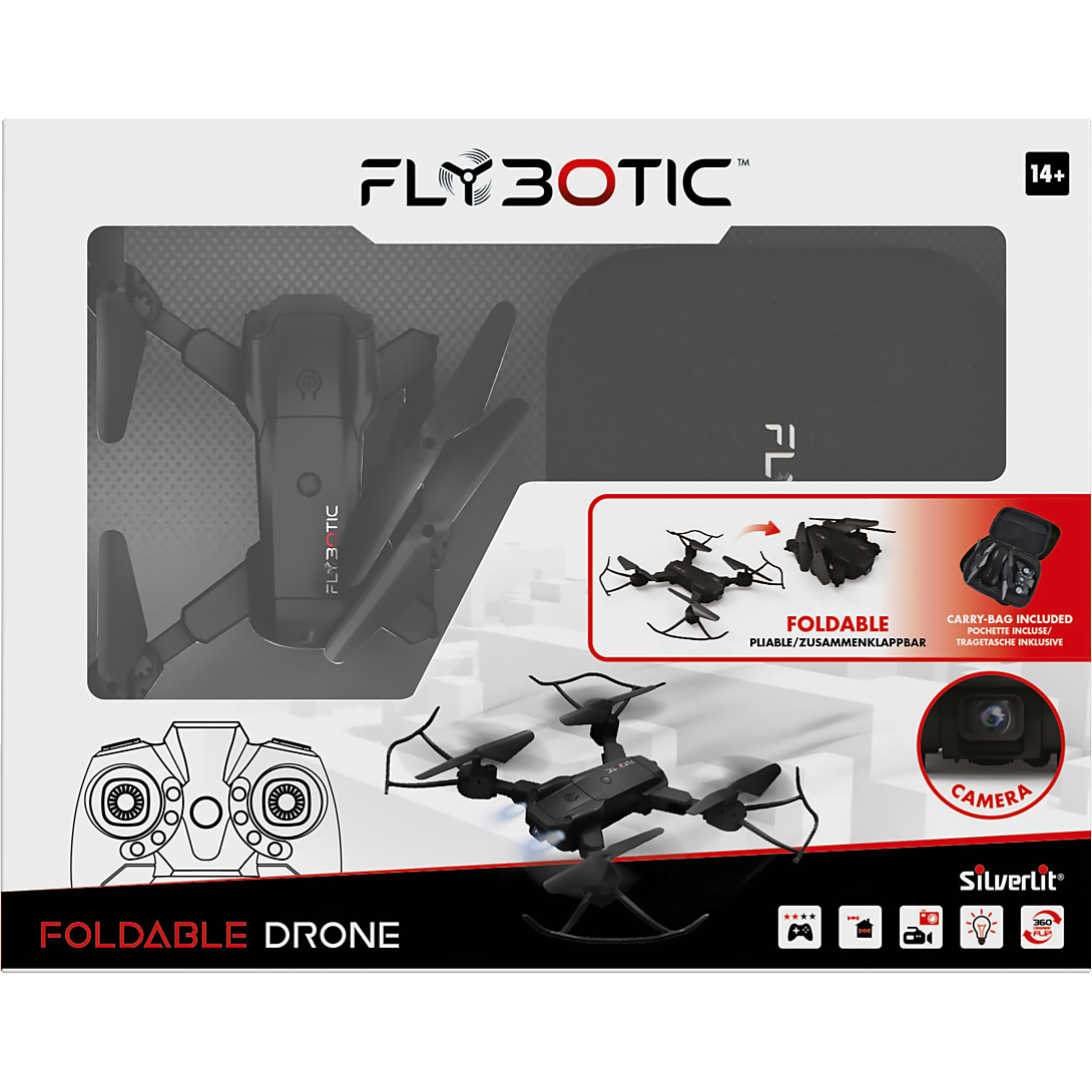 FLYBOTIC Foldable Drone Le drone repliable avec caméra embarquée de 33 cm ! Un drone repliable à emporter partout avec soi ! Doté d'une caméra embarquée de 480 pixels, il est parfait pour prendre des prises de vues spectaculaire Facile à piloter grâce à son vol stationnaire, il pourra être mis dans toutes les mains ! Effets lumineux et technologie 2.4Ghz pour une utilisation en extérieur. Recharge de la batterie via un câble USB (inclus). 4 rotors de rechange inclus. Dès 14ans. Il lui faut un temps de charge de 60 minutes pour un temps d'utilisation de 5 minutes. Une portée de 30 mètres. Amuses-toi avec ton premier drone comme un grand. À offrir pour n'importe quelle occasion. Comme un anniversaire, ou Noël ou même Pâques. Le packaging est une boîte fenêtrée. En ce qui concerne la batterie, il suffit simplement de retirer la batterie du compartiment située à l'arrière du drone afin de recharger la batterie.