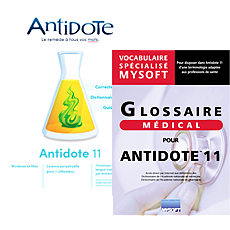 Le glossaire médicalLe Glossaire médical pour Antidote 11 permet à tous ceux qui ont à rédiger ou corriger des textes de médecine de bénéficier, au sein même d'Antidote 11, d'un vocabulaire parfaitement adapté.
