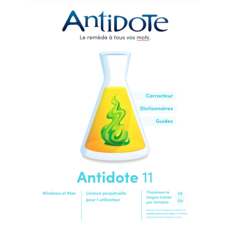 Antidote réunit un correcteur de nouvelle génération, des dictionnaires avec recherche puissante et des guides linguistiques clairs et détaillés. Ces multiples ouvrages ne sont pas simplement plaqués ensemble : ils interagissent harmonieusement pour explorer les différents aspects d'une question linguistique. Individuellement, chacun de ces ouvrages rivalise avec les meilleurs de sa catégorie. Ensemble, ils n'ont pas d'égal. Chacun des ouvrages d'Antidote est une somme : plus de cent trente-trois mille mots, neuf cent mille cooccurrences, un million de synonymes, neuf mille verbes et cinquante mille alertes sont ainsi mis à votre disposition. Et chaque ouvrage offre plusieurs outils de travail de la langue, tels les filtres intelligents du correcteur et les multiples modes de recherche dans les dictionnaires. Tous les ouvrages sont réunis en trois fenêtres. Dans chaque fenêtre, une disposition nette et un minimum de boutons. Un processus de correction simple, rapide et efficace. Et une foison de petites touches intelligentes en sous-main, invisibles. La puissance d'Antidote se présente sobrement et s'apprivoise facilement. Antidote est de plus accessible directement de votre texte par un simple clic sur un bouton ou dans un menu. Pas de conversion de fichier, pas de perte de temps : vous écrivez, un doute vous assaille, vous cliquez, Antidote vous éclaire. Antidote, c'est la façon moderne, rapide et pratique d'écrire un français sans faute et avec les mots justes.