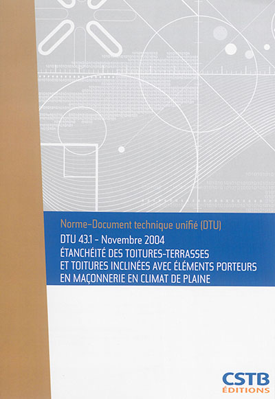 | Titre de l'œuvre | DTU 43.1 Etanchéité des toitures-terrasses et toitures inclinées avec éléments porteurs en maçonnerie en climat de plaine. Nouvelle formule |
