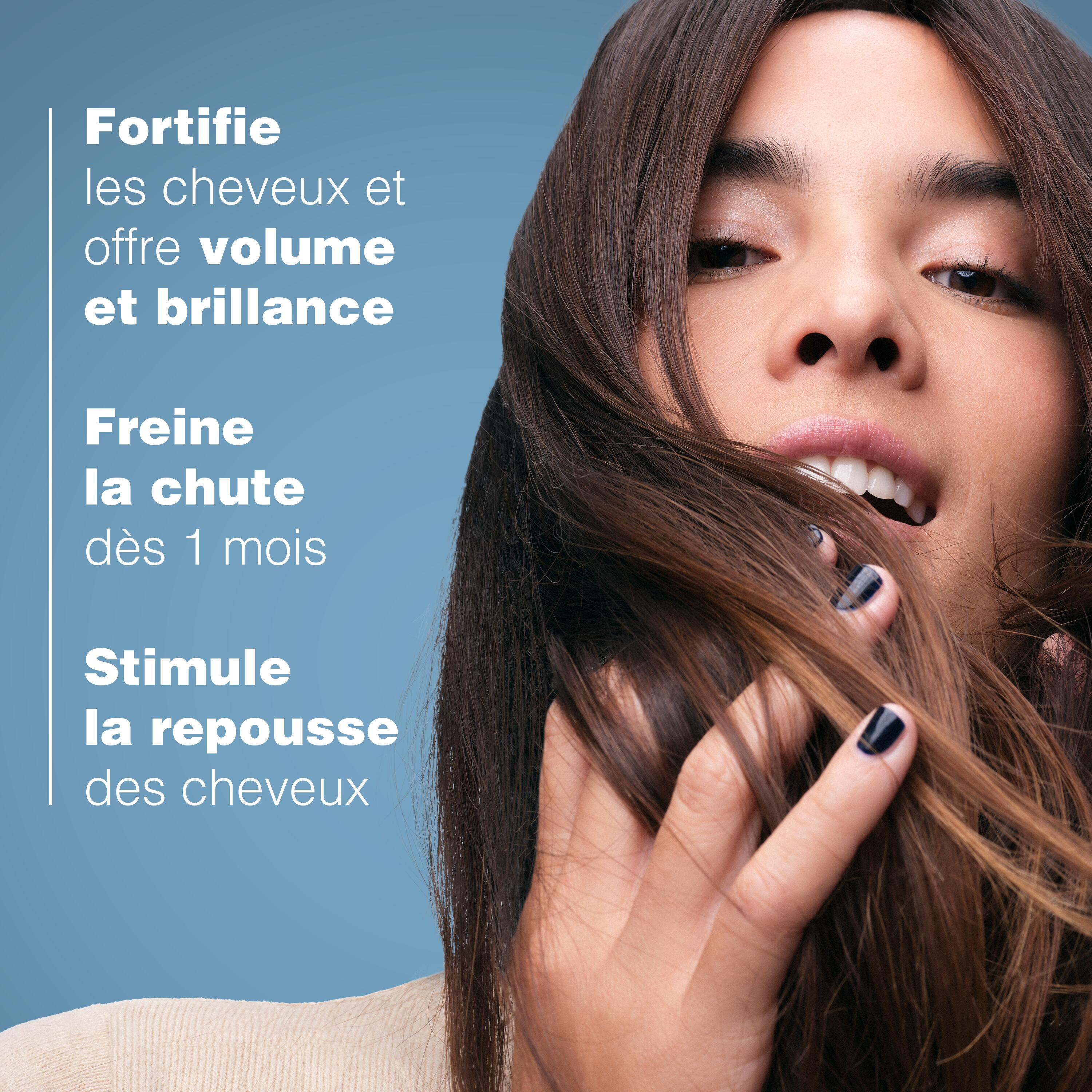 Le shampooing antichute et croissance freine la chute réactive et stimule la repousse des cheveux* pour une chevelure plus forte et volumineuse. FREINE la chute réactive dès 1 mois** pour des cheveux plus denses. REACTIVE la pousse de nouveaux cheveux dès 1 mois FORTIFIE les cheveux et offre volume et brillance dès 7 jours***. *à partir de follicules pileux existants **Etude clinique, 44 sujets ***% de satisfaction, étude clinique réalisée sur 100 sujets