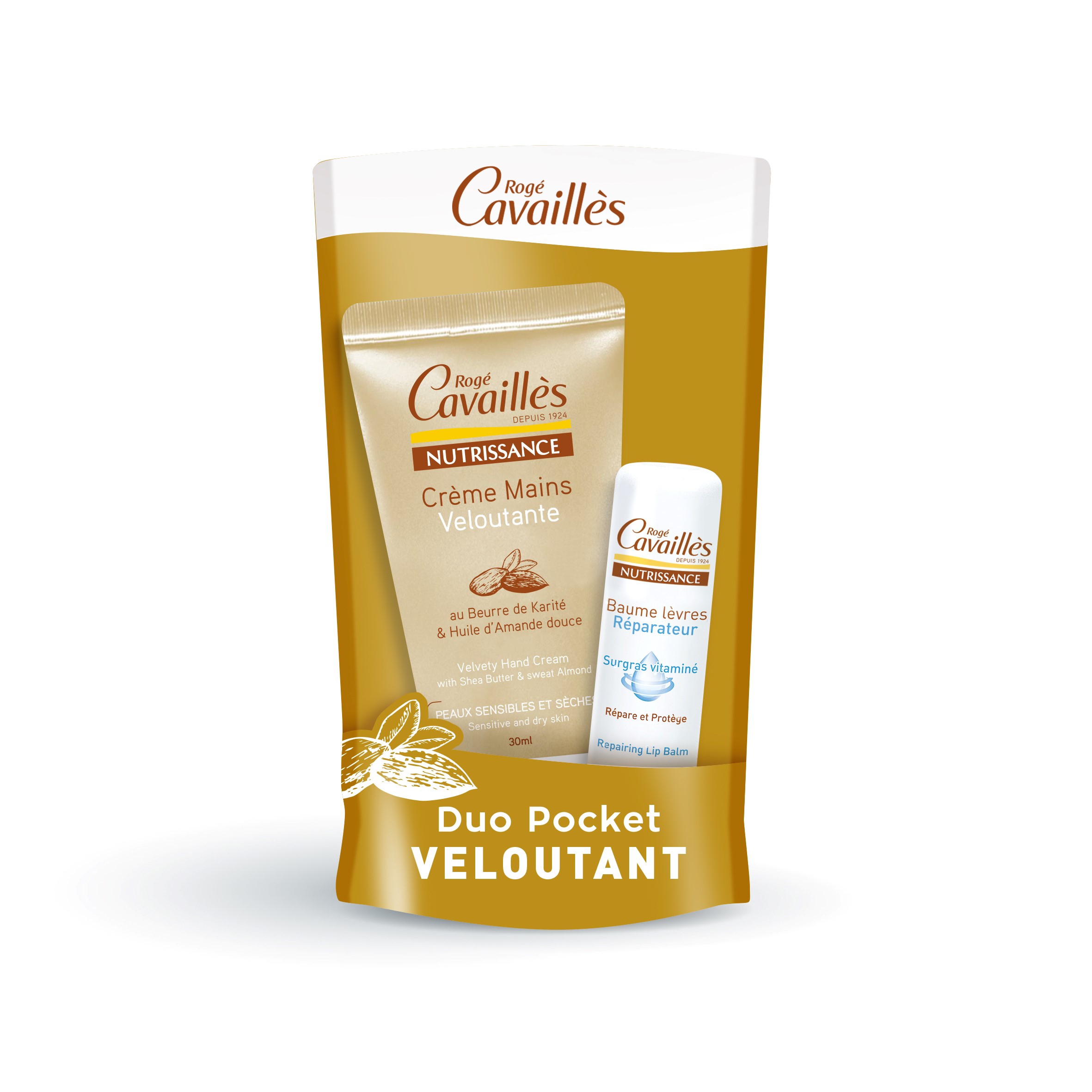 Rogé Cavaillès Duo Pocket Veloutant Crème Mains Veloutante 30 ml + Baume Lèvres 5,5 ml est composé de deux soins réparateurs, pour retrouver le plaisir d'une peau douce. - Rogé Cavaillès Nutrissance Baume Lèvres Réparateur 5,5 ml surgras et vitaminé répare et protège les lèvres très abîmées, gercées ou craquelées. Facile à transporter, il soigne vos lèvres en toutes circonstances. 97% des ingrédients sont d'origine naturelle. - Rogé Cavaillès Nutrissance Crème Mains Veloutante 30 ml enrichie en surgras vitaminé, beurre de karité et huile d'amande douce hydrate et répare les mains sèches et abîmées. Les mains sont souples et douces. 97% des ingrédients sont d'origine naturelle.