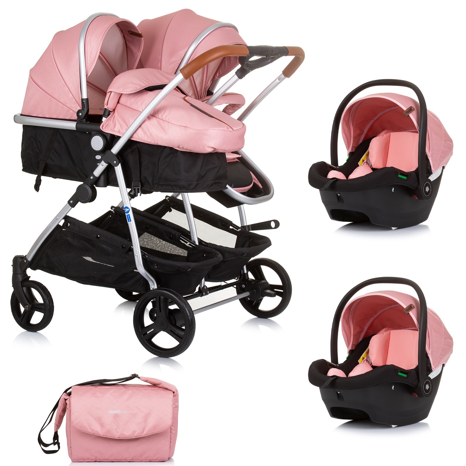 DUO SMART Poussette jumeaux ou enfants rapprochés largeur 79 cm Flamant rose + 2 cosy rose