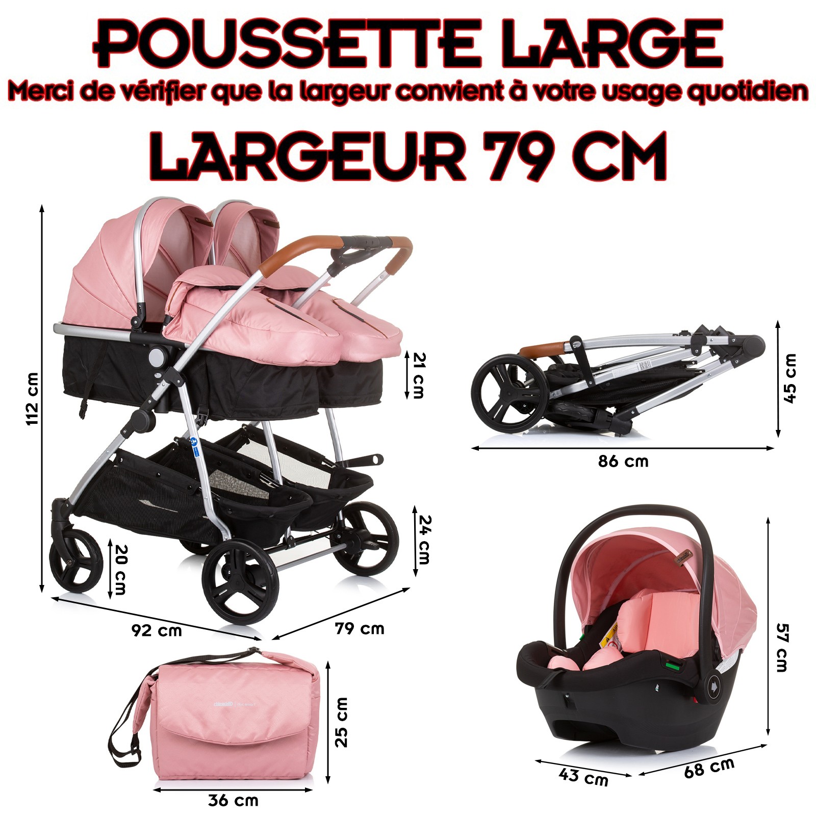 POUSSETTE JUMEAUX OU ENFANTS RAPPROCHÉS. ATTENTION : CETTE POUSSETTE EST LARGE (LARGEUR 79 cm). MERCI DE VÉRIFIER QUE CELA CORRESPOND À VOTRE UTILISATION QUOTIDIENNE (PORTES, TRANSPORTS...) Cette poussette double et évolutive convient aux jumeaux et aux enfants d'âges rapprochés. EXISTE EN 2 MODÈLES Poussette duo (incluant les 2 nacelles) OU poussette duo + 2 cosy CARACTÉRISTIQUES Cadre en aluminium léger facile à plier Roues avec suspensions + frein Roues avant pivotantes à 360° (possibilité de les bloquer dans l'axe) 2 sacs à langer et 2 paniers de rangement Installation nacelle face ou dos à la route Normes Européennes EN1888-1 NACELLE COUCHÉE ET ASSISE Convient aux enfants jusqu'à 15 kg Nacelle souple inclinable en assise (3 positions) Harnais de sécurité 5 points + épaulettes Arceaux et chancelière amovible Capote réglable + pare-soleil intégré OPTION COSY Convient aux bébés entre 40 et 87 cm (jusqu'à 13 kg / 0-15 mois) Réducteurs et appui-tête rembourrés Intérieur déhoussable/lavable Poignée réglable Harnais de sécurité à 3 points (type Y) + épaulettes Capote rétractable/amovible Base à bascule Adaptateurs fournis Installation face aux parents Normes ECE R129/03 Les nacelles (et cosy en option) peuvent être installées indépendamment sur le châssis de la poussette. DIMENSIONS Poussette : L 92 cm x largeur 79 cm x H 112 cm. Nacelle : L 86 cm x l 34 cm x H 21 cm. 3 kg. Cosy : L 68 cm x l 43 cm x H 57 cm. 3,25 kg. Poids du cadre : 8,70 kg.