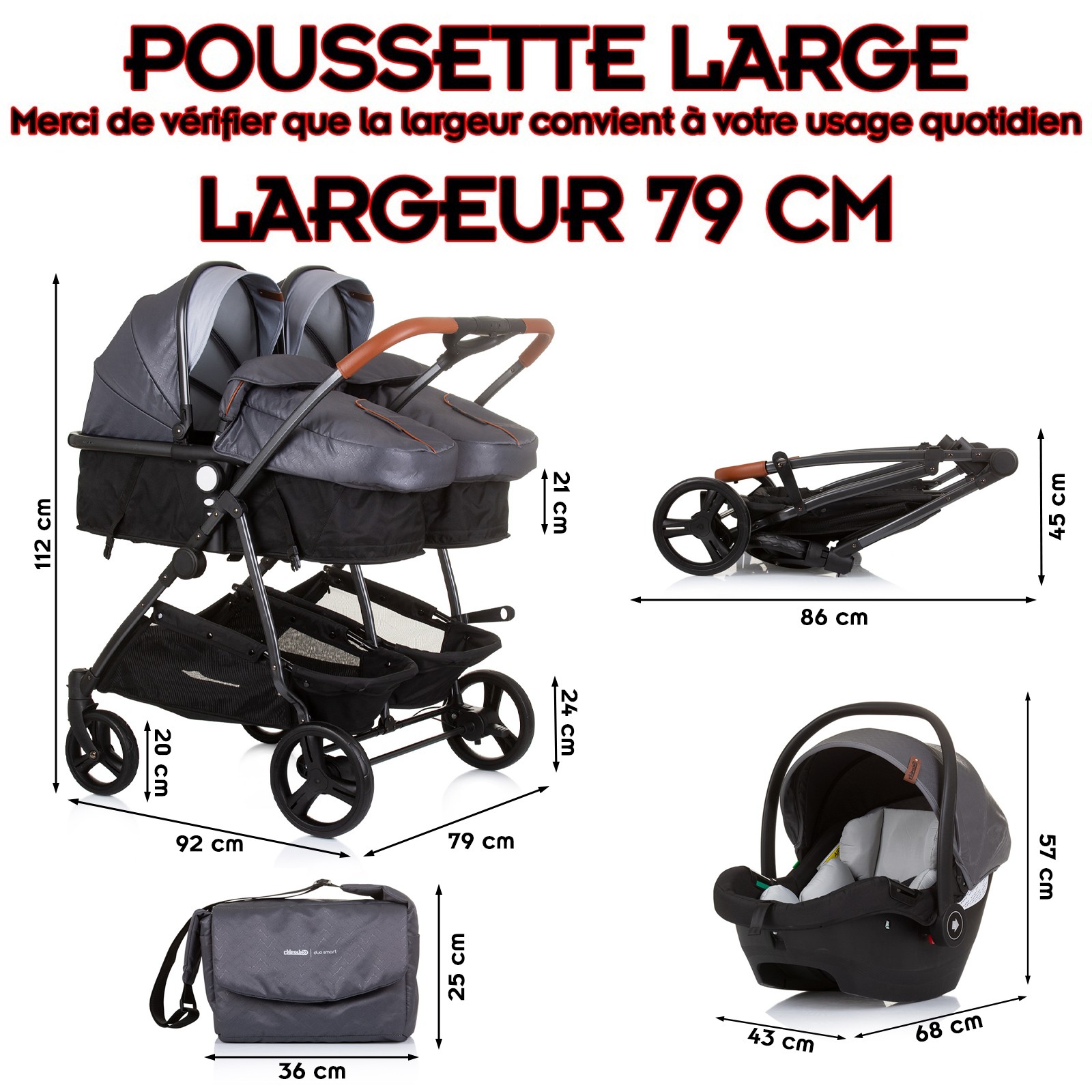 POUSSETTE JUMEAUX OU ENFANTS RAPPROCHÉS. ATTENTION : CETTE POUSSETTE EST LARGE (LARGEUR 79 cm). MERCI DE VÉRIFIER QUE CELA CORRESPOND À VOTRE UTILISATION QUOTIDIENNE (PORTES, TRANSPORTS...) Cette poussette double et évolutive convient aux jumeaux et aux enfants d'âges rapprochés. EXISTE EN 2 MODÈLES Poussette duo (incluant les 2 nacelles) OU poussette duo + 2 cosy CARACTÉRISTIQUES Cadre en aluminium léger facile à plier Roues avec suspensions + frein Roues avant pivotantes à 360° (possibilité de les bloquer dans l'axe) 2 sacs à langer et 2 paniers de rangement Installation nacelle face ou dos à la route Normes Européennes EN1888-1 NACELLE COUCHÉE ET ASSISE Convient aux enfants jusqu'à 15 kg Nacelle souple inclinable en assise (3 positions) Harnais de sécurité 5 points + épaulettes Arceaux et chancelière amovible Capote réglable + pare-soleil intégré OPTION COSY Convient aux bébés entre 40 et 87 cm (jusqu'à 13 kg / 0-15 mois) Réducteurs et appui-tête rembourrés Intérieur déhoussable/lavable Poignée réglable Harnais de sécurité à 3 points (type Y) + épaulettes Capote rétractable/amovible Base à bascule Adaptateurs fournis Installation face aux parents Normes ECE R129/03 Les nacelles (et cosy en option) peuvent être installées indépendamment sur le châssis de la poussette. DIMENSIONS Poussette : L 92 cm x largeur 79 cm x H 112 cm. Nacelle : L 86 cm x l 34 cm x H 21 cm. 3 kg. Cosy : L 68 cm x l 43 cm x H 57 cm. 3,25 kg. Poids du cadre : 8,70 kg.