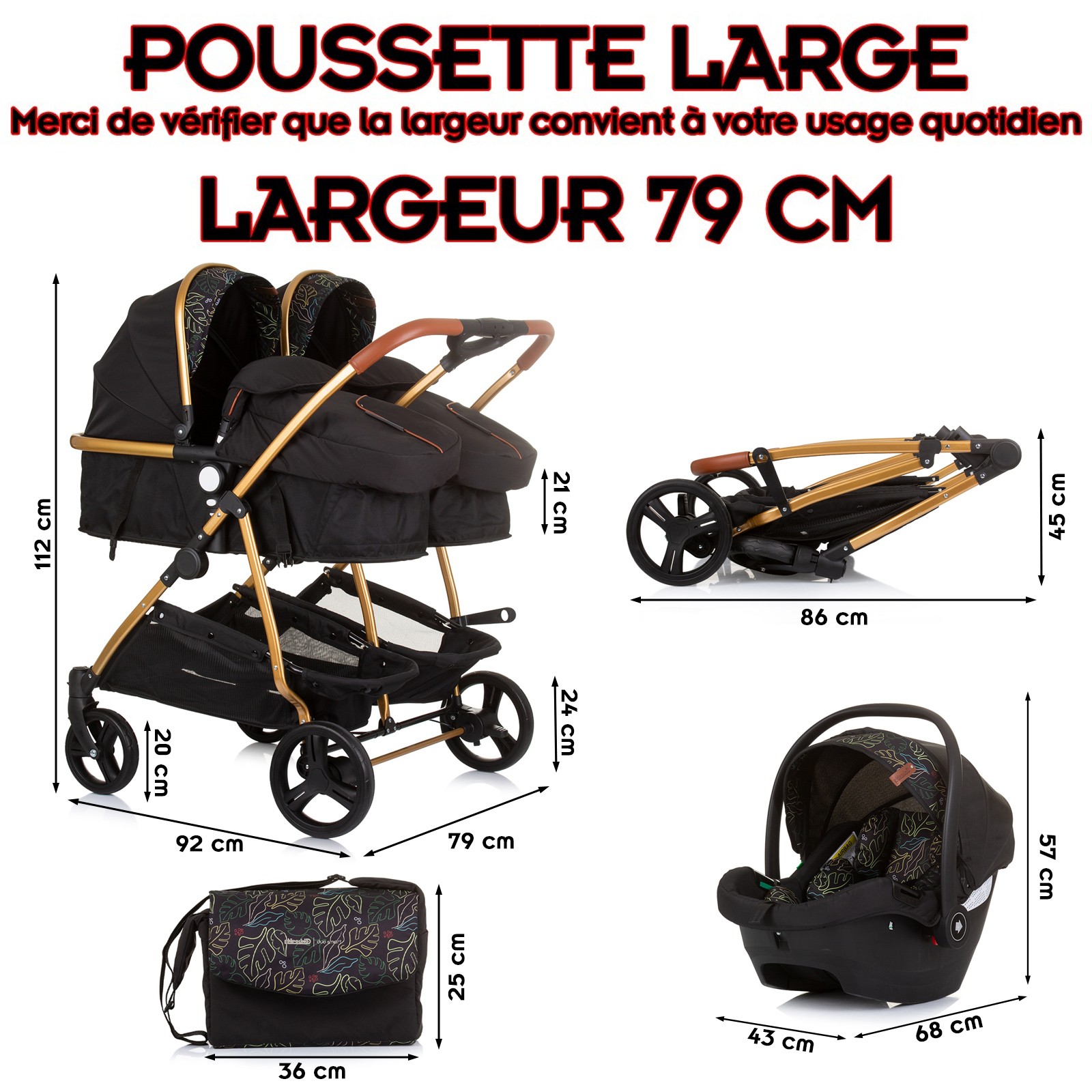POUSSETTE JUMEAUX OU ENFANTS RAPPROCHÉS. ATTENTION : CETTE POUSSETTE EST LARGE (LARGEUR 79 cm). MERCI DE VÉRIFIER QUE CELA CORRESPOND À VOTRE UTILISATION QUOTIDIENNE (PORTES, TRANSPORTS...) Cette poussette double et évolutive convient aux jumeaux et aux enfants d'âges rapprochés. EXISTE EN 2 MODÈLES Poussette duo (incluant les 2 nacelles) OU poussette duo + 2 cosy CARACTÉRISTIQUES Cadre en aluminium léger facile à plier Roues avec suspensions + frein Roues avant pivotantes à 360° (possibilité de les bloquer dans l'axe) 2 sacs à langer et 2 paniers de rangement Installation nacelle face ou dos à la route Normes Européennes EN1888-1 NACELLE COUCHÉE ET ASSISE Convient aux enfants jusqu'à 15 kg Nacelle souple inclinable en assise (3 positions) Harnais de sécurité 5 points + épaulettes Arceaux et chancelière amovible Capote réglable + pare-soleil intégré OPTION COSY Convient aux bébés entre 40 et 87 cm (jusqu'à 13 kg / 0-15 mois) Réducteurs et appui-tête rembourrés Intérieur déhoussable/lavable Poignée réglable Harnais de sécurité à 3 points (type Y) + épaulettes Capote rétractable/amovible Base à bascule Adaptateurs fournis Installation face aux parents Normes ECE R129/03 Les nacelles (et cosy en option) peuvent être installées indépendamment sur le châssis de la poussette. DIMENSIONS Poussette : L 92 cm x largeur 79 cm x H 112 cm. Nacelle : L 86 cm x l 34 cm x H 21 cm. 3 kg. Cosy : L 68 cm x l 43 cm x H 57 cm. 3,25 kg. Poids du cadre : 8,70 kg.