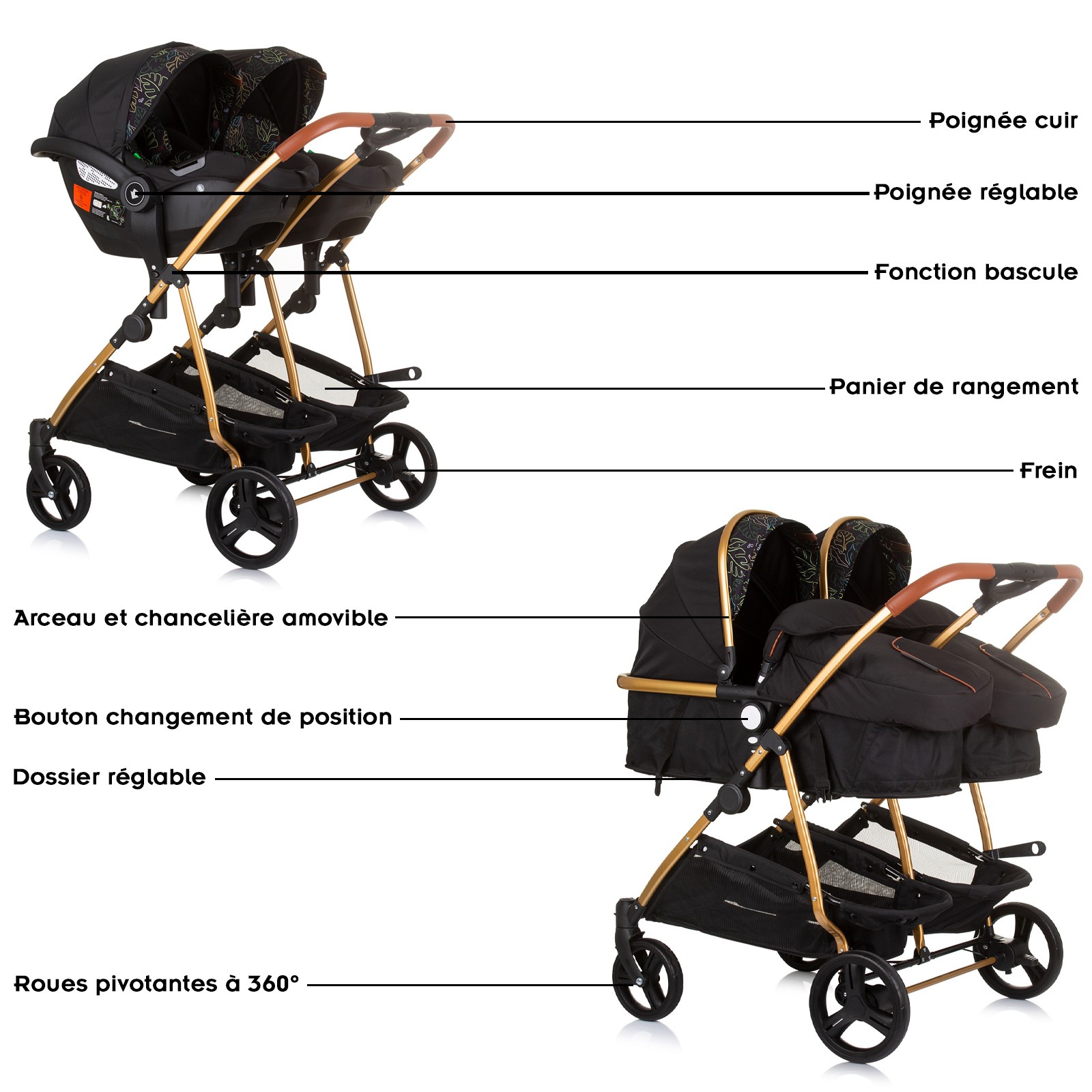 | Libellé | DUO SMART Poussette jumeaux ou enfants rapprochés largeur 79 cm Noir / Feuilles + 2 cosy noir/feuilles |