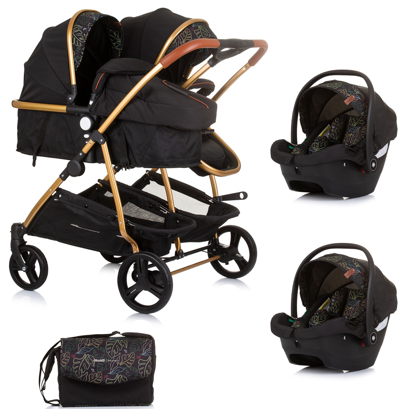 DUO SMART Poussette jumeaux ou enfants rapprochés largeur 79 cm Noir / Feuilles + 2 cosy noir/feuill