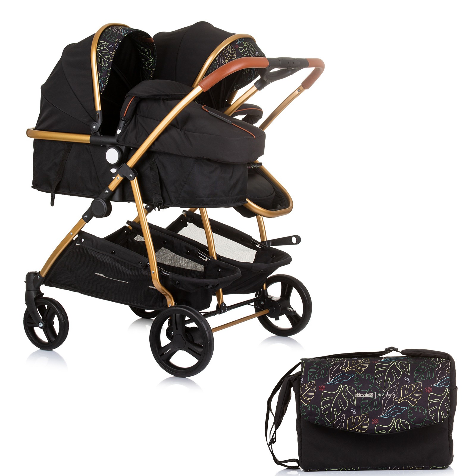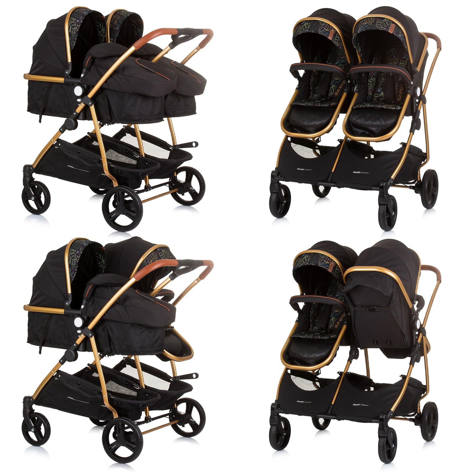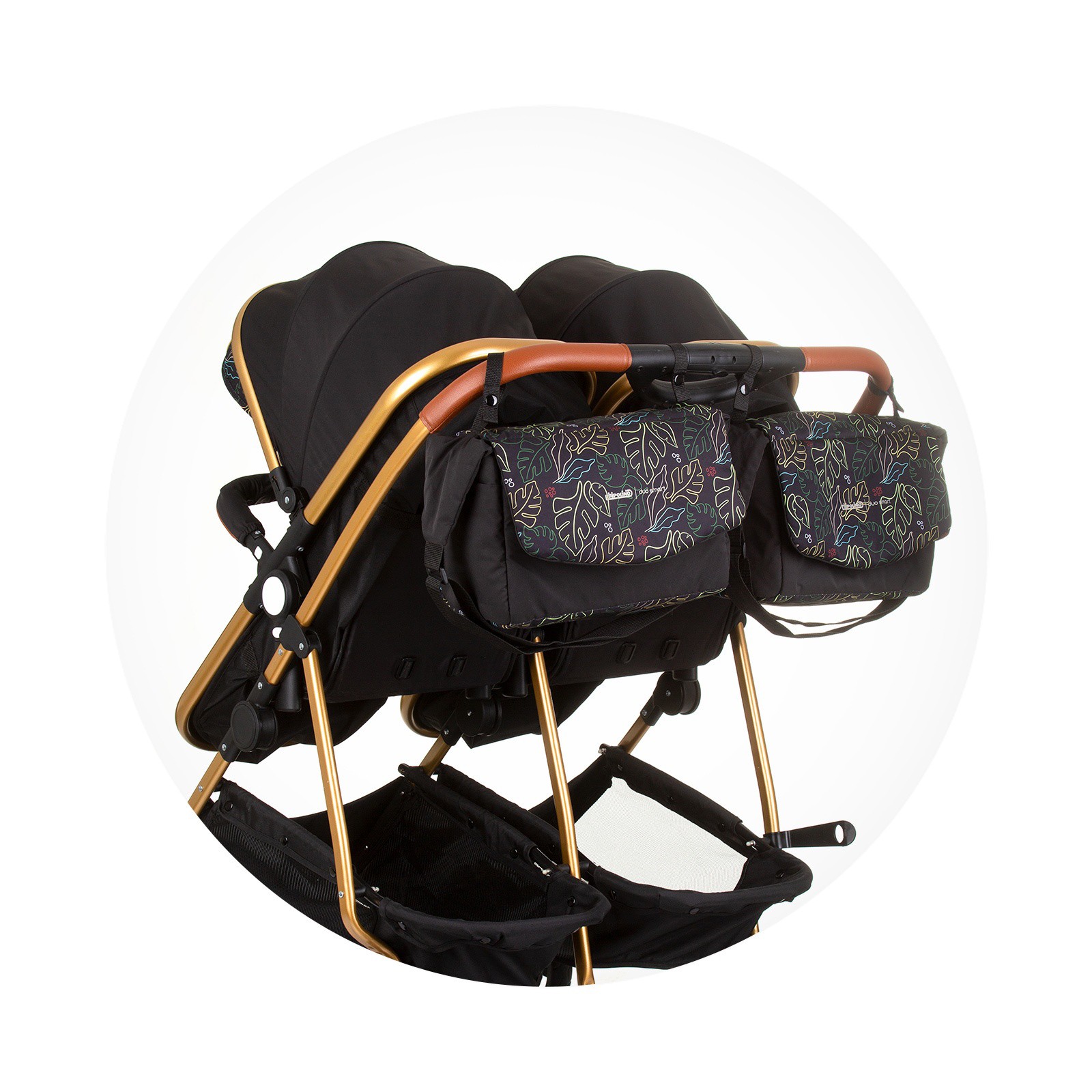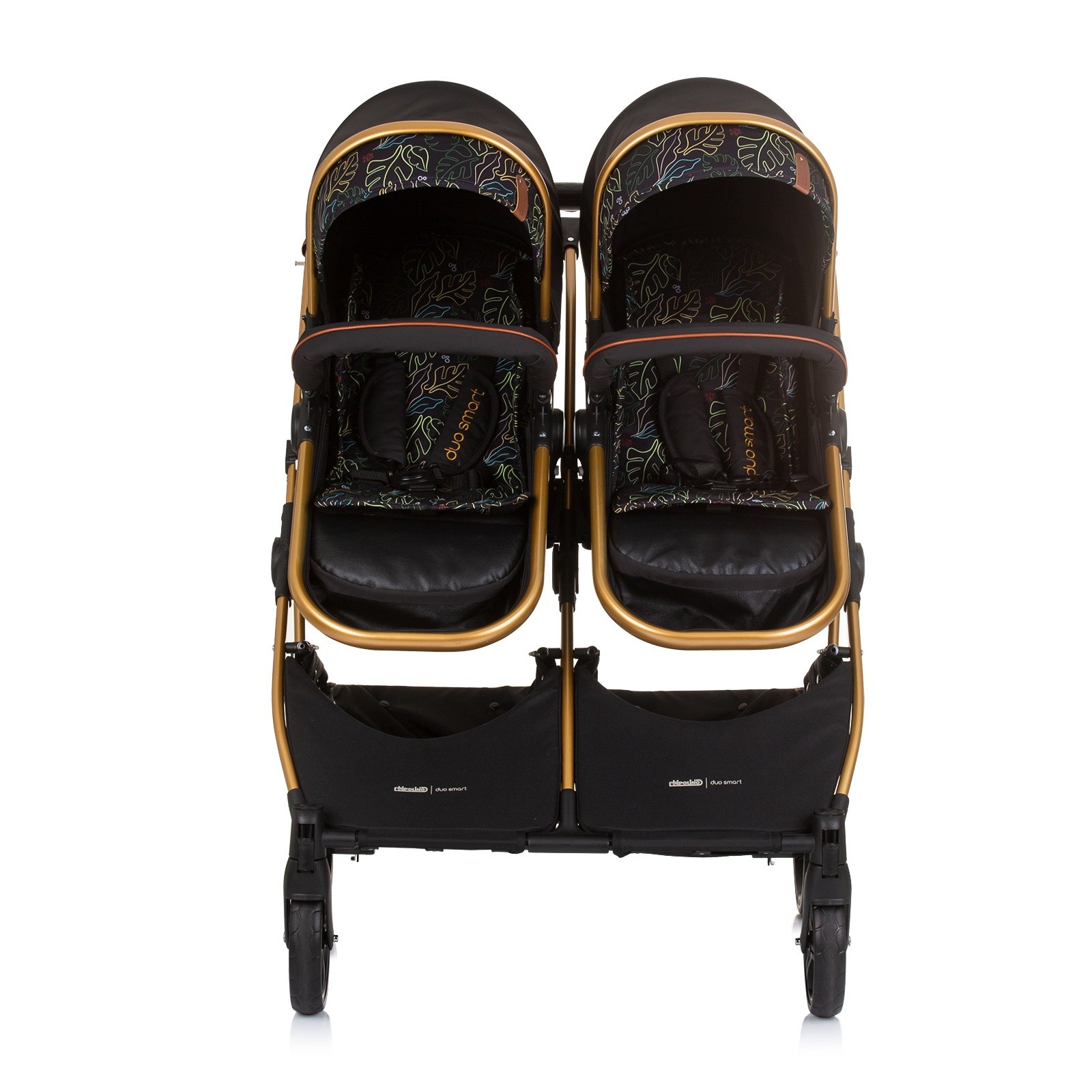 DUO SMART Poussette jumeaux ou enfants rapprochés largeur 79 cm Noir / Feuilles sans cosy
