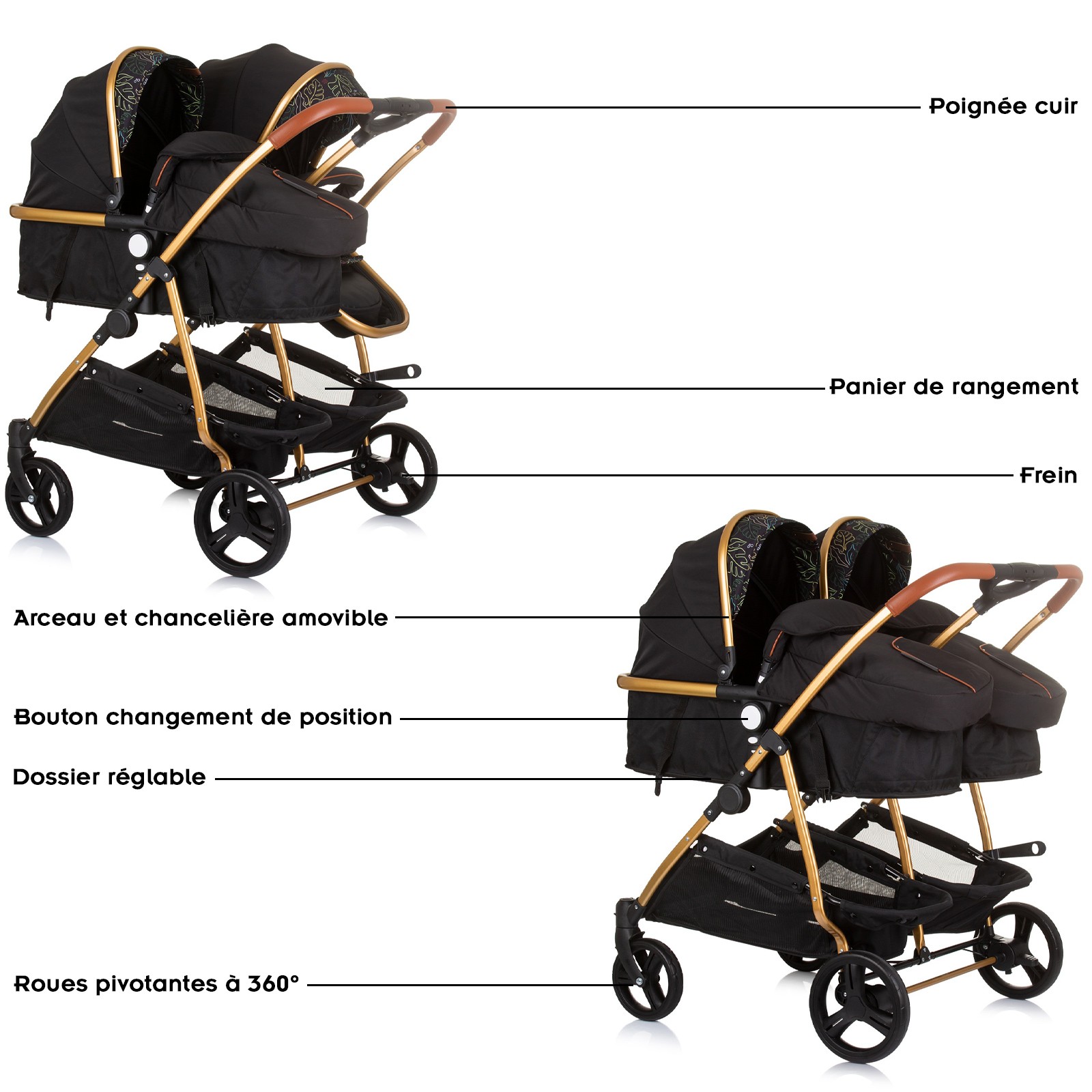 | Libellé | DUO SMART Poussette jumeaux ou enfants rapprochés largeur 79 cm Noir / Feuilles sans cosy |