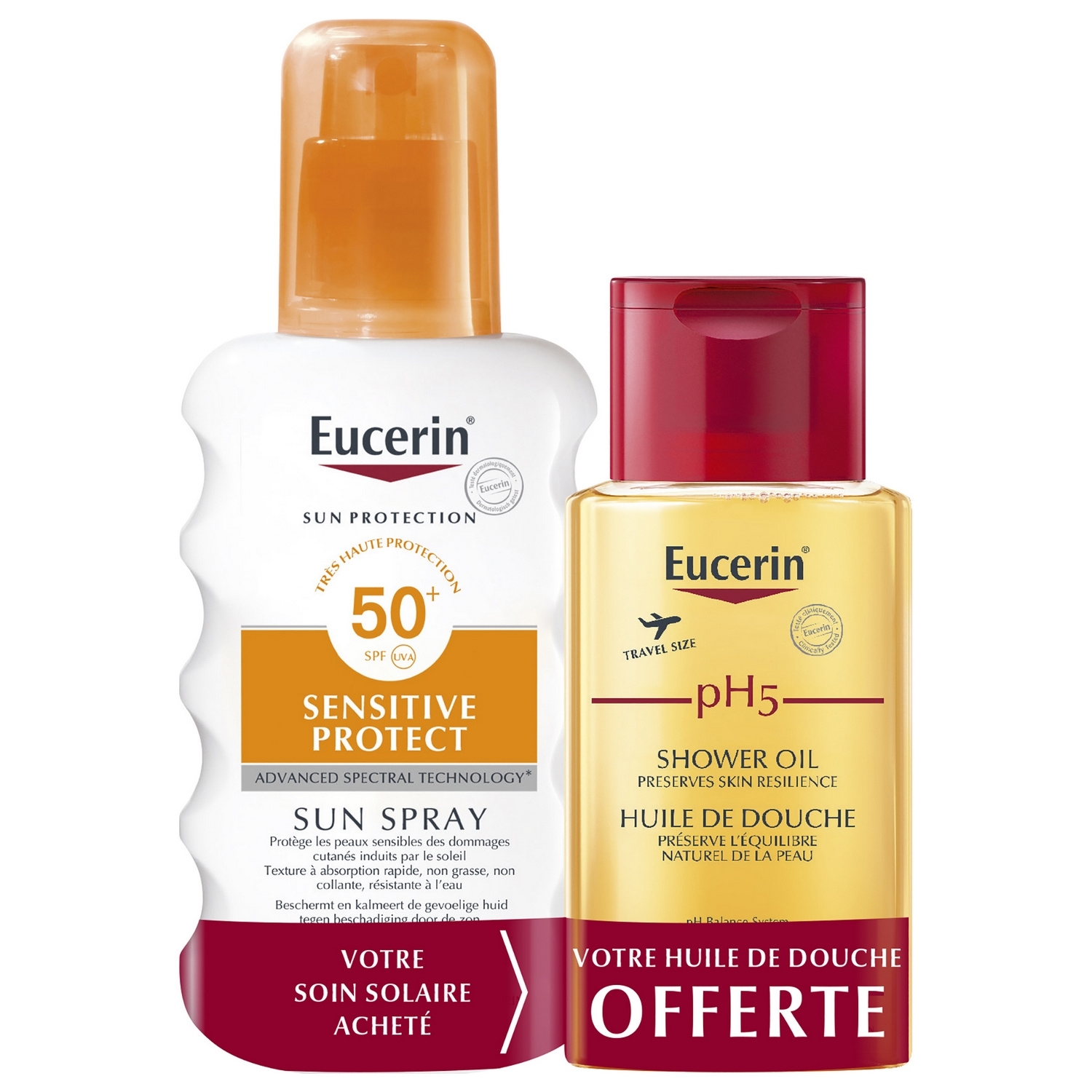 SUN SENSITIVE PROTECT Spray SPF 50+ - 200ml: Le SUN SENSITIVE PROTECT Spray SPF 50+ à la formule innovante protège la peau des dommages liés à une exposition au soleil grâce à un système de filtres UVA/UVB. La licochalcone A aide à neutraliser les radicaux libres causés par les UV et la lumière de Haute Energie Visible. pH5 Huile de Douche 100ml : pH5 Protection Huile de Douche 1L protège les défenses naturelles de la peau et préserve sa capacité à résister face aux agressions extérieures grâce à une valeur de pH optimale. Résultat: La peau est nettoyée en douceur et la résistance de la peau face aux aggressions extérieures est préservée. - Mousse légèrement à l'application - Contient une haute concentration d'huiles de soin naturelles pour réduire les tiraillements de la peau - Laisse une sensation de peau douce et souple, protège du dessèchement, même en cas de lavages fréquents - Convient à un usage quotidien, même sur les peaux sujettes aux allergies (par exemple Type I - rhinite allergique) - Convient aux enfants à partir de 3 ans Des études cliniques et dermatologiques le prouvent: très bonne tolérance cutanée et très bonne efficacité sur les peaux sensibles et sèches.