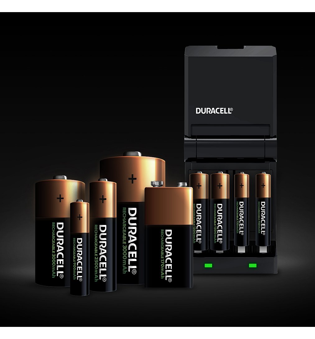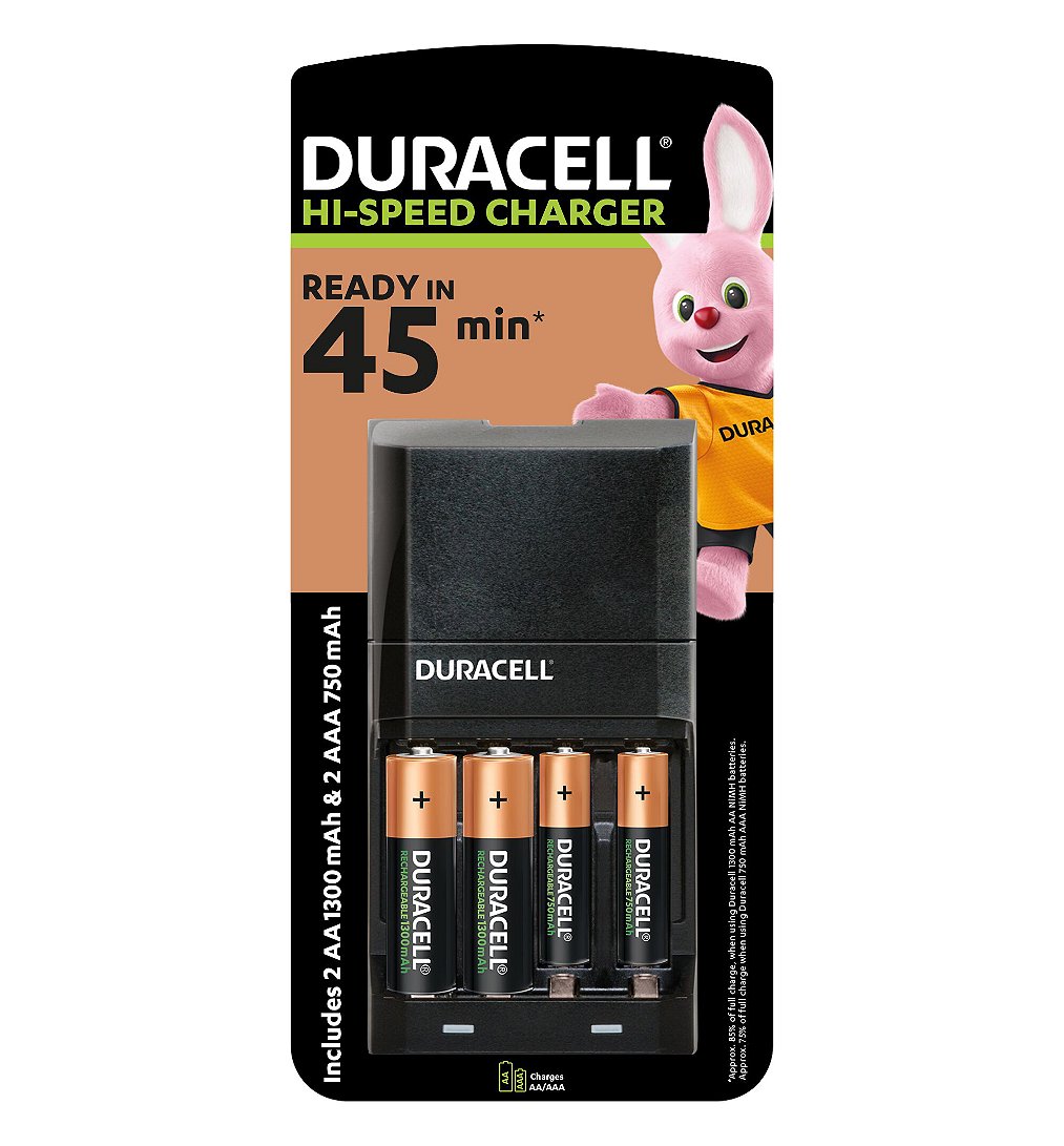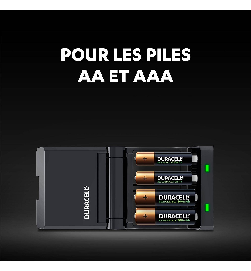 Le chargeur de piles Duracell Hi-Speed chargé en seulement 45 minutes (*environ 85% de charge pleine, en utilisant les piles Duracell 1 300mAh AA NiMH; environ 75% de charge pleine, en utilisant les piles Duracell 750mAh AAA NiMH). Lorsque vous êtes en déplacement, que vous souhaitez divertir vos enfants avec une manette de jeu vidéo entièrement chargée ou prendre des photos de votre vie trépidante, vous avez besoin de batteries sur lesquelles vous pouvez compter. Le chargeur Duracell Hi-Speed est votre solution rapide et mobile pour vous aider à avancer et ne plus vous arrêter à cause de batteries vides. Ses 9 fonctions de sécurité vous permettent de poursuivre vos activités sans inquiétudes et une fois les batteries complètement chargées, le chargeur s'éteint automatiquement pour éviter toute surchauffe. Ce chargeur Duracell est garanti 10 ans, vous pouvez donc compter chaque jour sur la puissance longue durée Duracell. Continuez à vivre votre vie à pleine puissance et laissez vos batteries vous accompagner - où que vous alliez.