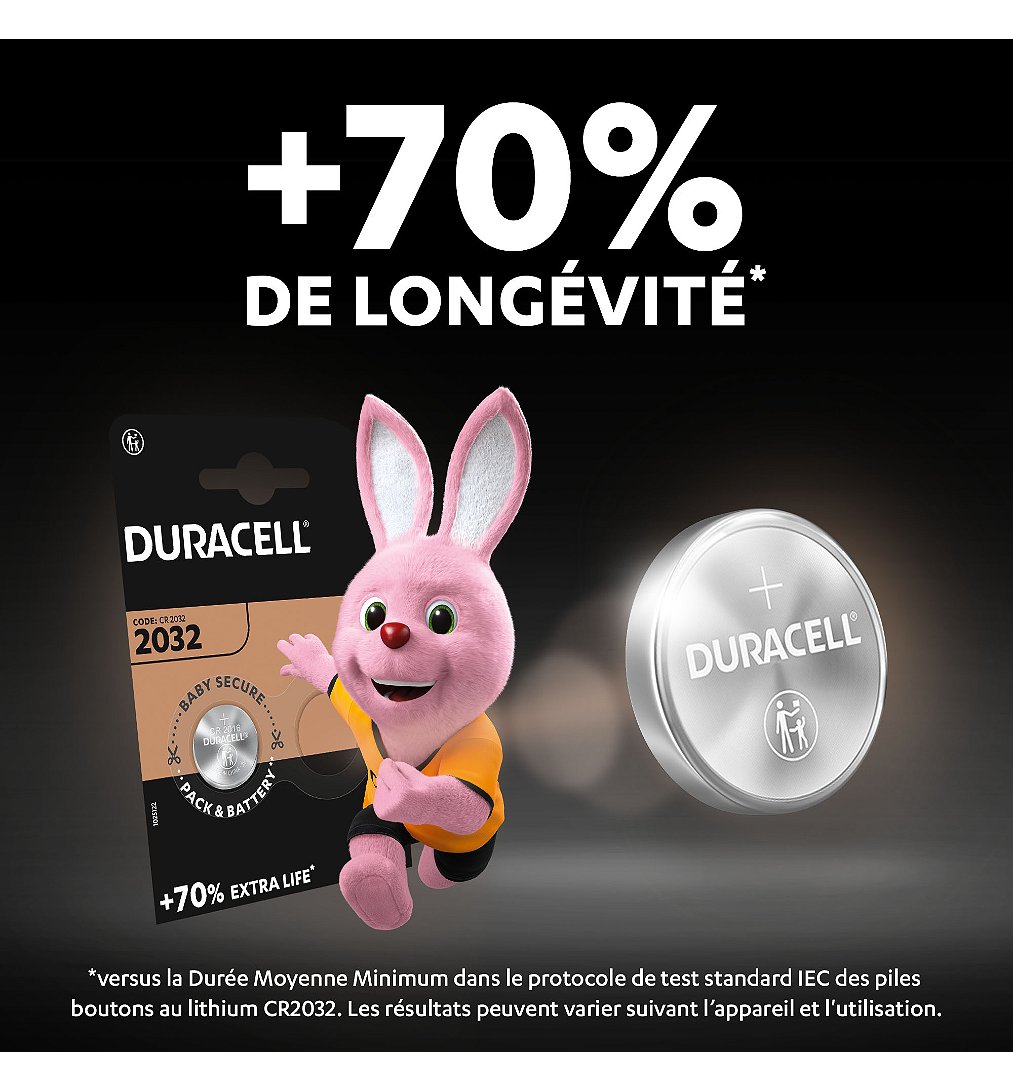 Les piles boutons au lithium Duracell 2032 sont fabriquées à base de lithium de haute qualité pour durer +70% plus longtemps* (*par rapport à la durée moyenne minimum des tests standard IEC pour les piles boutons au lithium 2032. Les résultats peuvent varier suivant l'appareil et l'utilisation.) pour vos appareils spécialisés. Elles bénéficient d'une garantie de stockage pouvant aller jusqu'à 10 ans, vous pouvez donc être sûr que ces piles boutons au lithium seront prêtes lorsque vous en aurez besoin. Pour assurer la sécurité de vos enfants et les dissuader d'avaler, Duracell a mis au point une sécurité enfant, une couche au goût amer appliquée sur la face arrière de la pile, et a conçu un emballage inviolable avec double blister de sorte qu'il est impossible pour un enfant de l'ouvrir sans ciseaux. Elles peuvent être utilisées dans les porte-clés, petites télécommandes, balances, objets connectés, capteurs, appareils médicaux (glucomètres, thermomètres digitaux) et équipements sportifs (moniteurs de fréquence cardiaque, accessoires de vélo).